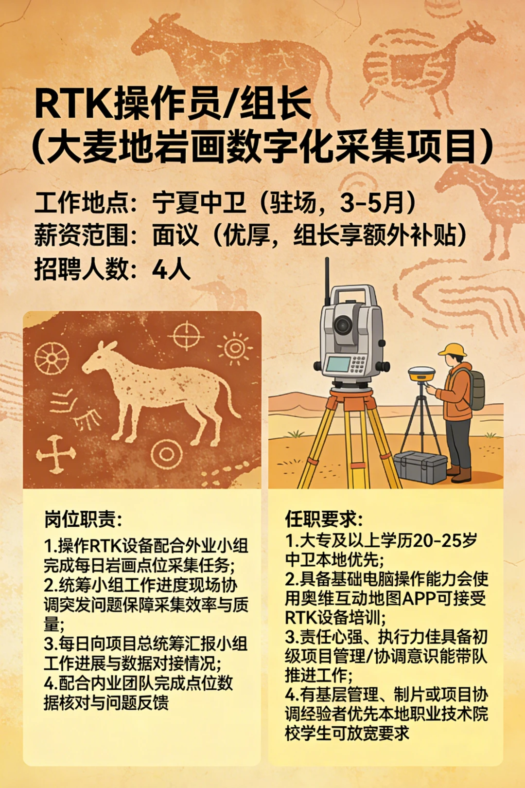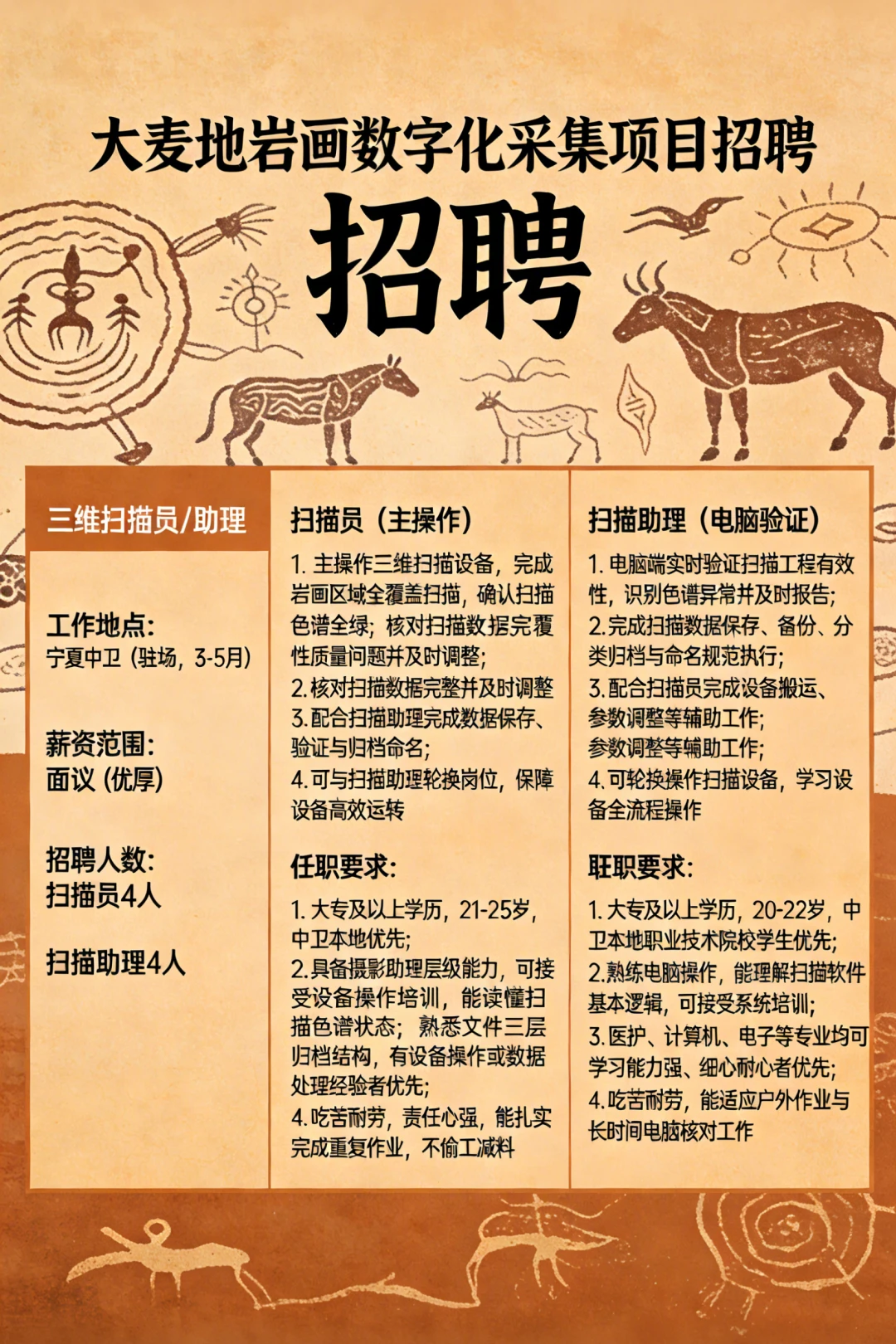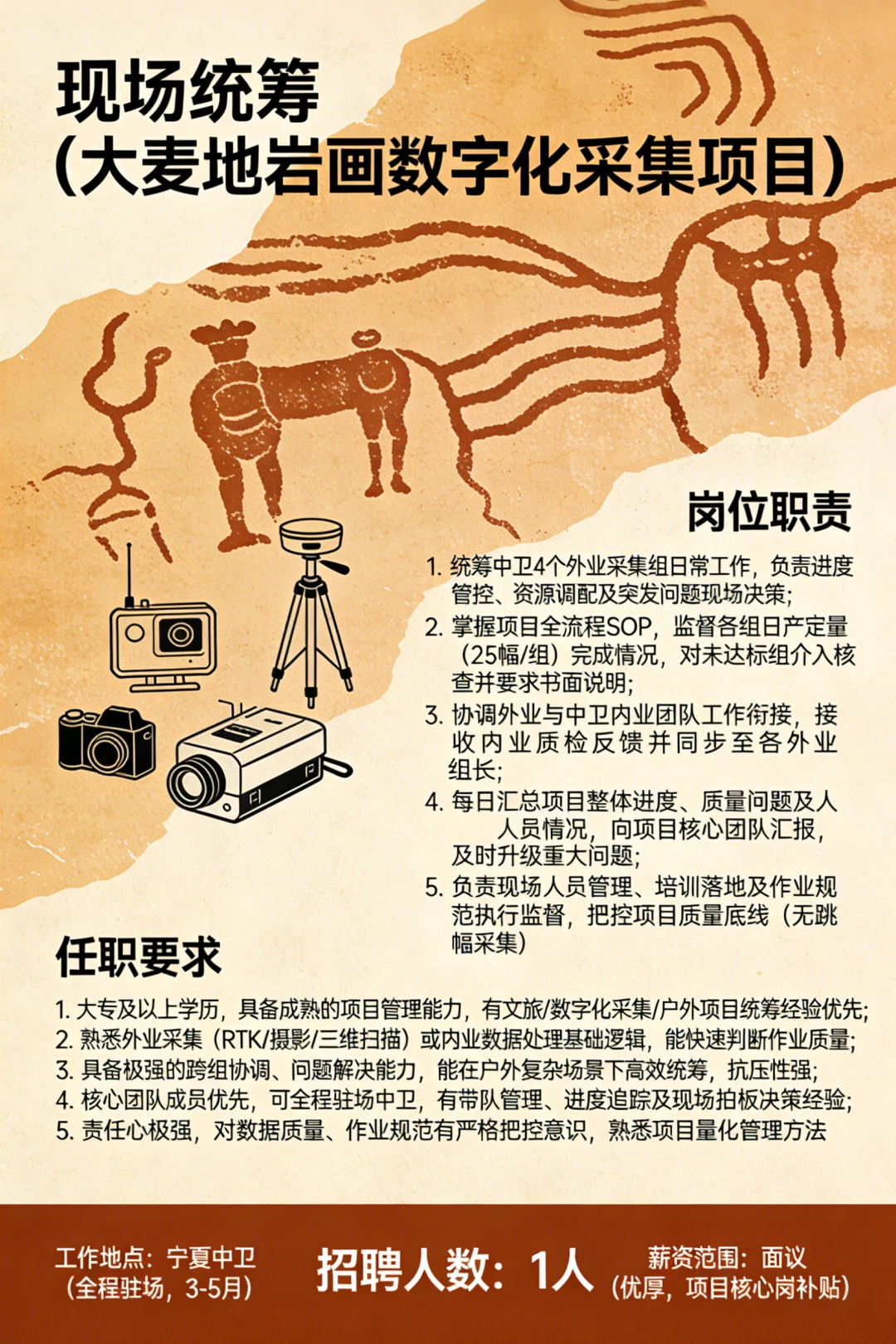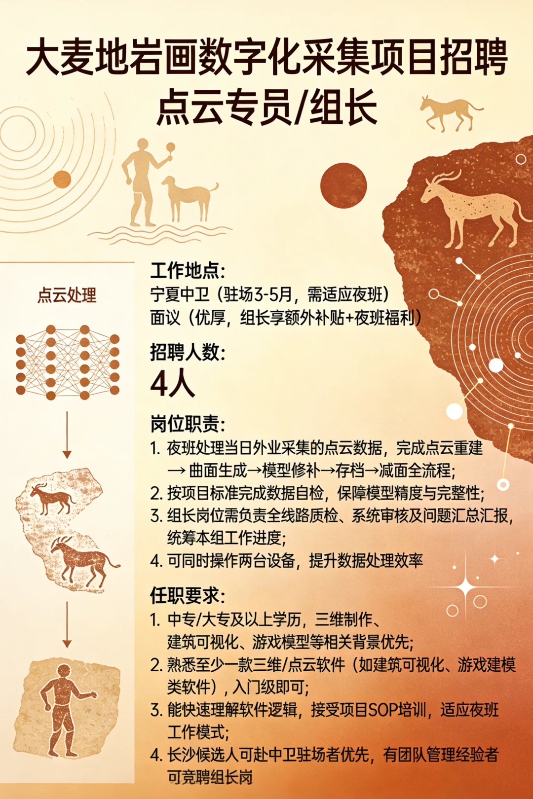 宁夏中卫 有着距今约一万年的史前刻痕 伟大而神秘 可惜知道的人太少 岩画众多分散又广泛 不加强保护 可能后人都不知道有岩画的存在 这次我们成立项目组 把大麦地岩画变成永久可持续的数字化资产 欢迎的朋友来自荐和推荐! (招聘信息在图7) 简历投递:lisiyu 中卫大麦地的岩画很神秘 夜晚的星空也很美 希望你有机会 跟我们一同探究万千南前的人类密码