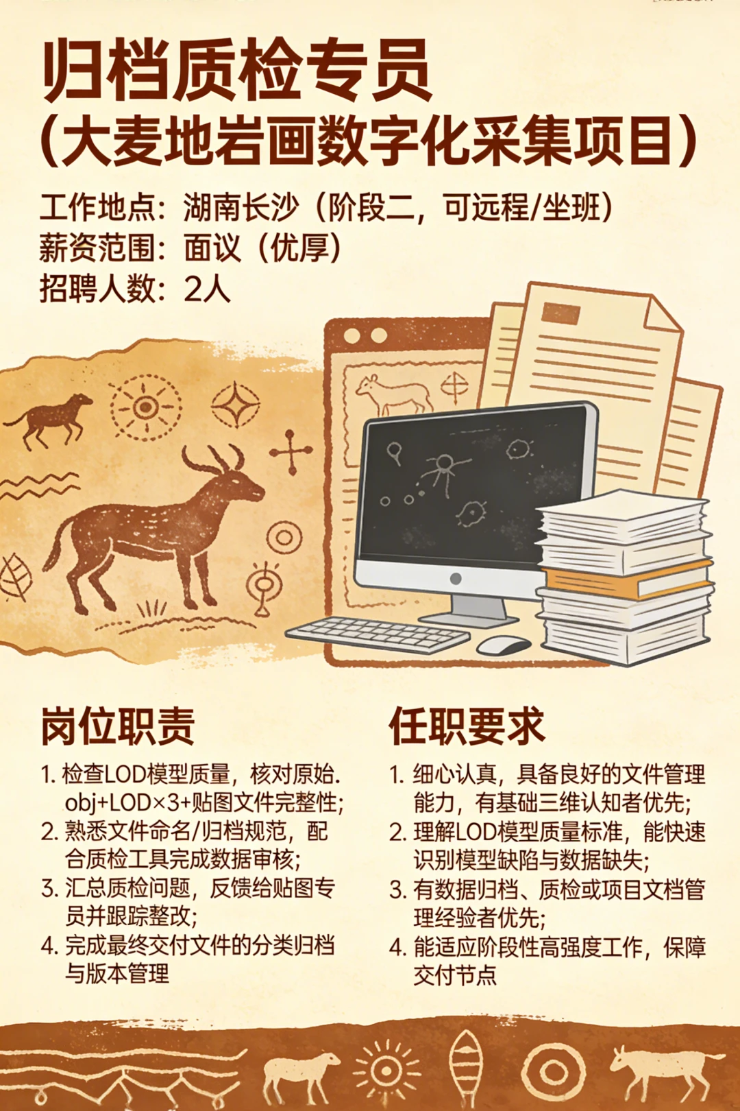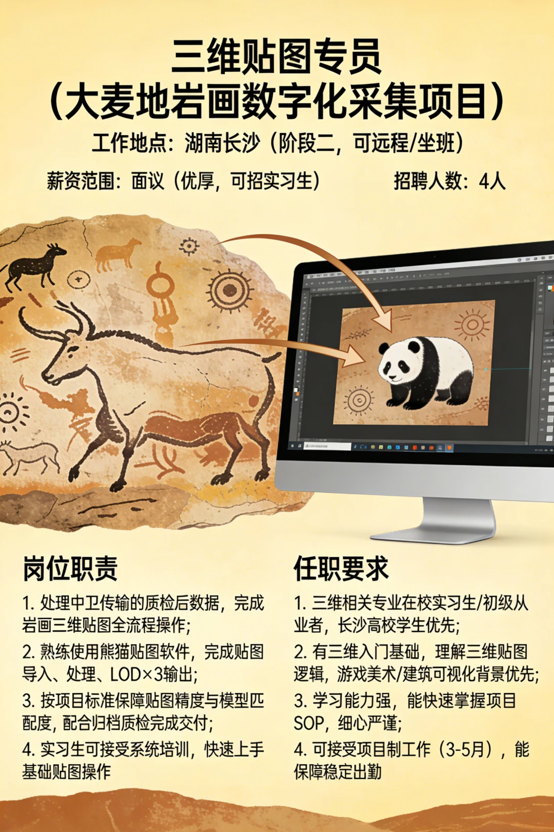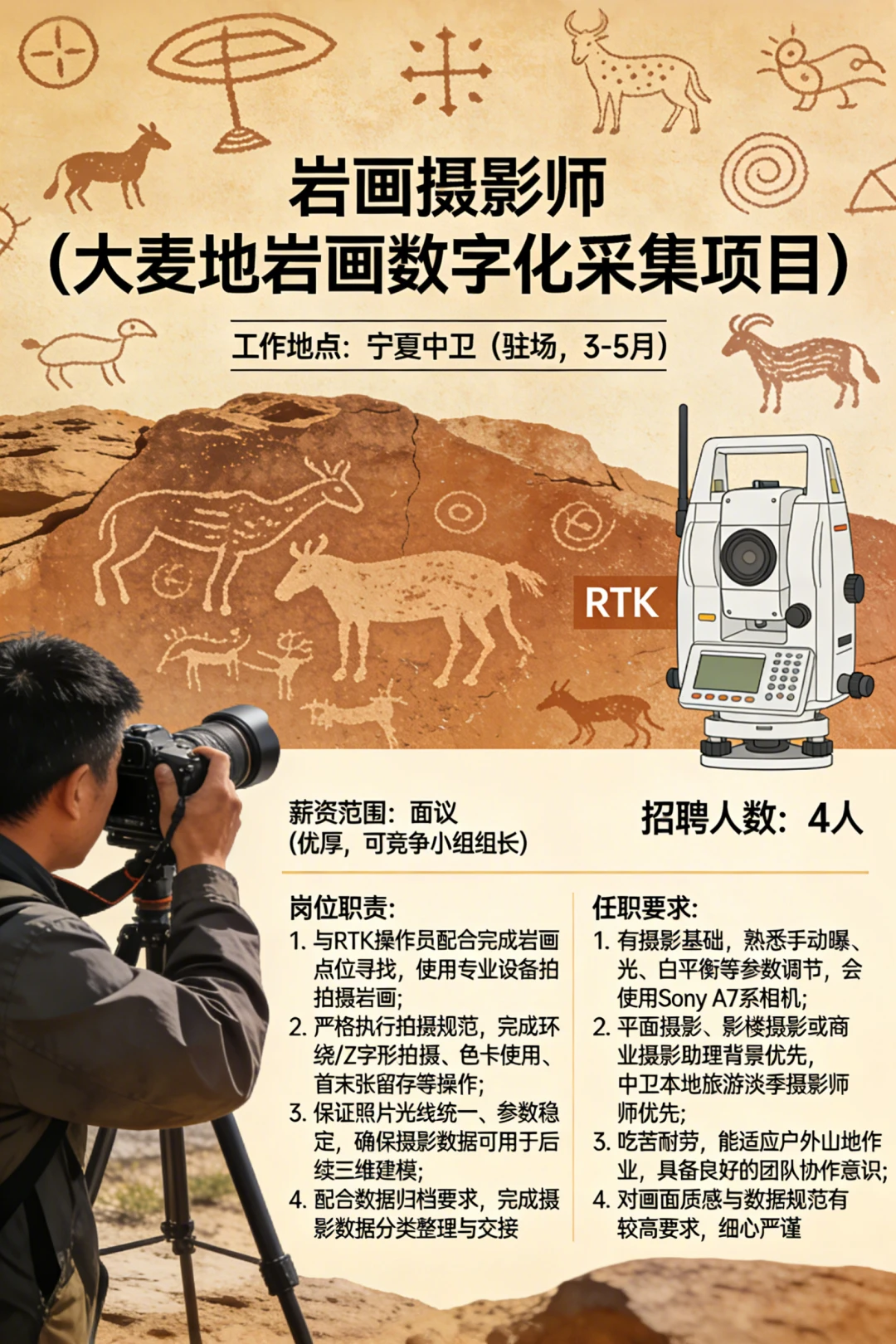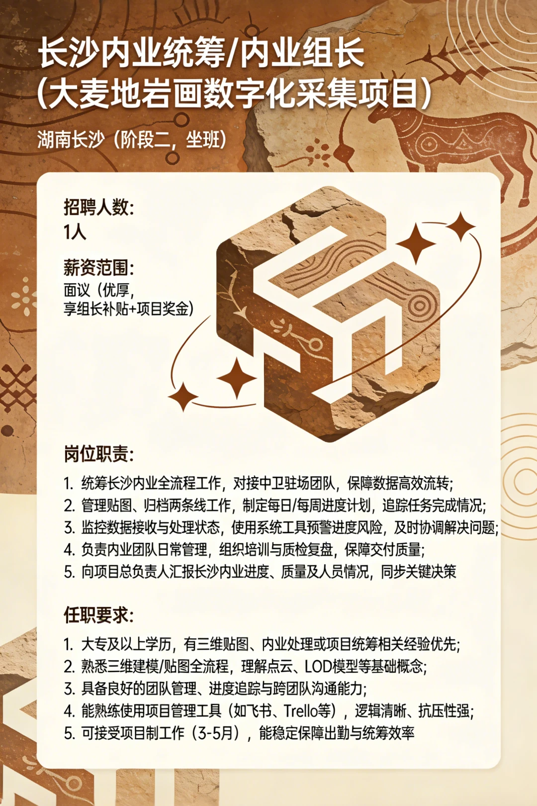 宁夏中卫 有着距今约一万年的史前刻痕 伟大而神秘 可惜知道的人太少 岩画众多分散又广泛 不加强保护 可能后人都不知道有岩画的存在 这次我们成立项目组 把大麦地岩画变成永久可持续的数字化资产 欢迎的朋友来自荐和推荐! (招聘信息在图7) 简历投递:lisiyu 中卫大麦地的岩画很神秘 夜晚的星空也很美 希望你有机会 跟我们一同探究万千南前的人类密码