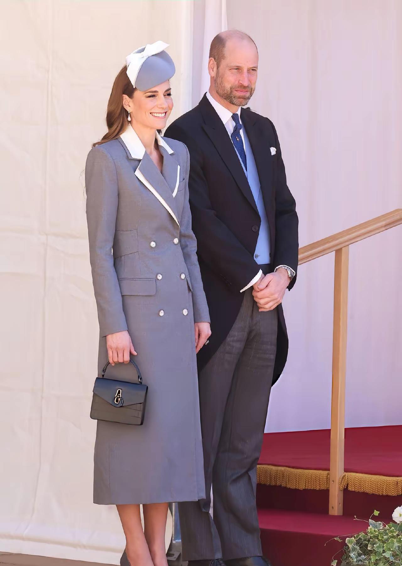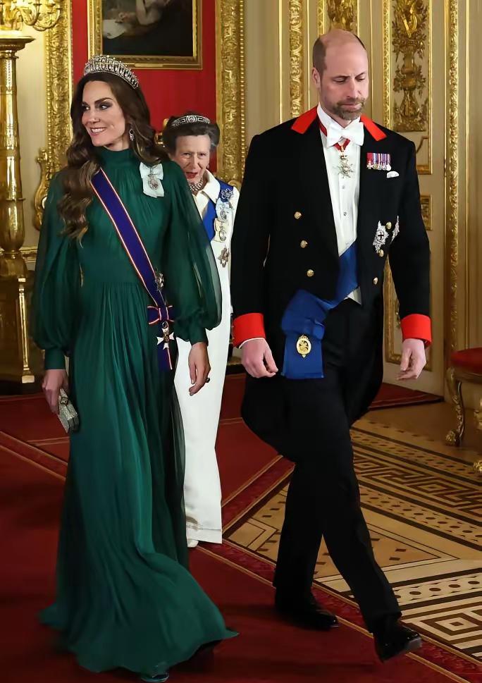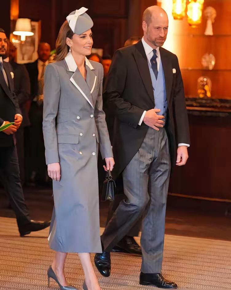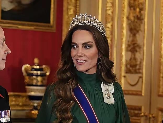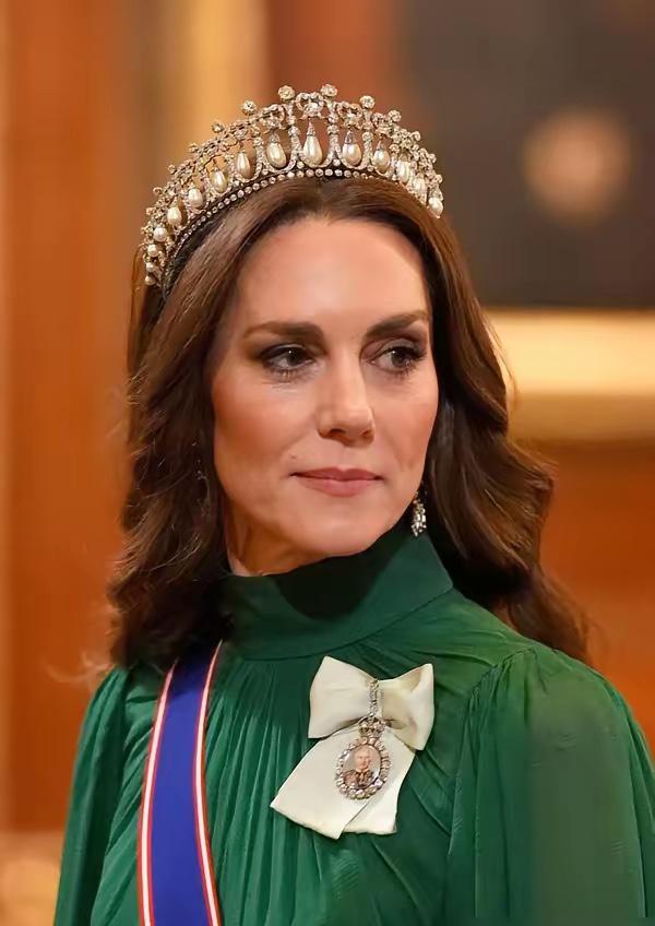 在这次英国国宴中凯特王妃又惊艳了我们的眼睛,在和威廉迎接尼日利亚总统夫妇时穿了一身灰白相间的长款风衣裙,包包和鞋子的颜色跟风衣的颜色一样。 国宴时穿的挂脖墨绿色泡泡袖礼服,带的还是她婆婆的剑桥情人节珍珠泪王冠,虽然凯特王妃已经解锁了很多王冠啦,不过她还是喜欢这一顶王冠。我总感觉有两种原因,一种是喜欢,另一种是恶心卡米拉,在她面前晃让她不能忘了她的上位经历。凯特穿搭
