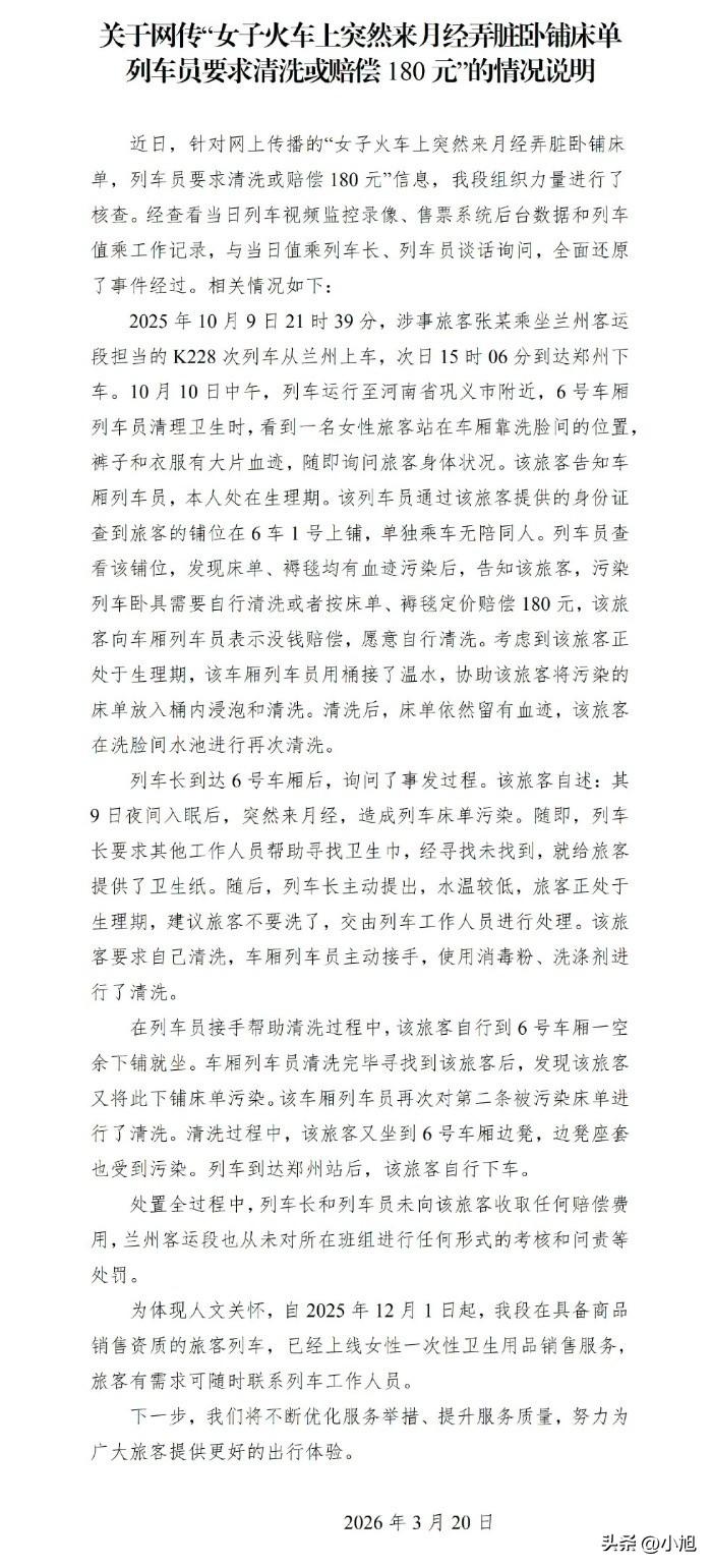 第三个点,也是最关键的一点。通报里把小张反复弄脏床单、列车员反复清洗的细节写得很清楚。写出来的目的是什么?是为了证明列车员服务态度好、不厌其烦。但反过来看,这个细节恰好暴露了一个问题:小张洗了、列车员洗了、换了地方坐又弄脏了。整个过程中,她一直在处理“漏”这件事,但始终没有一片卫生巾来解决问题。