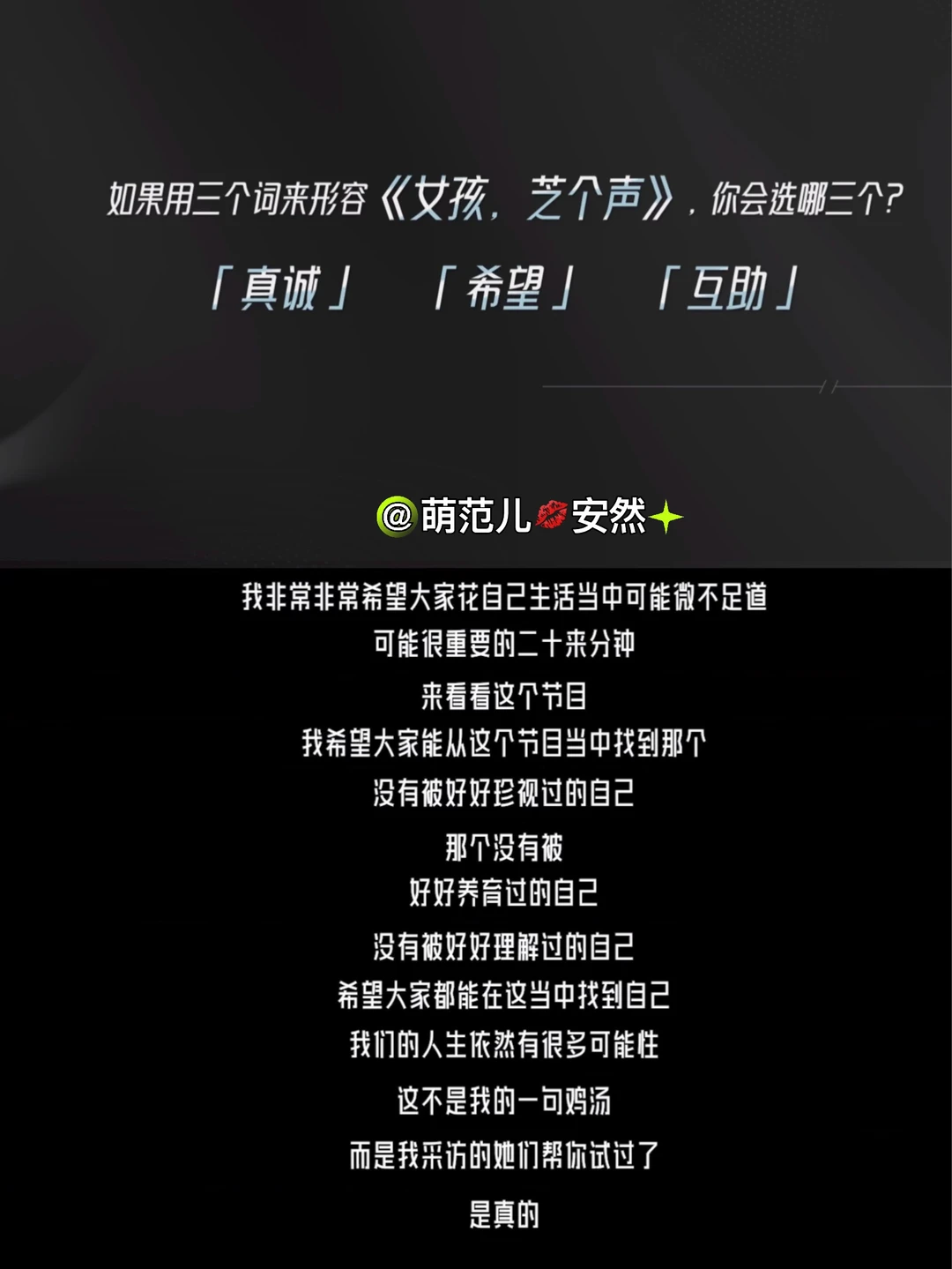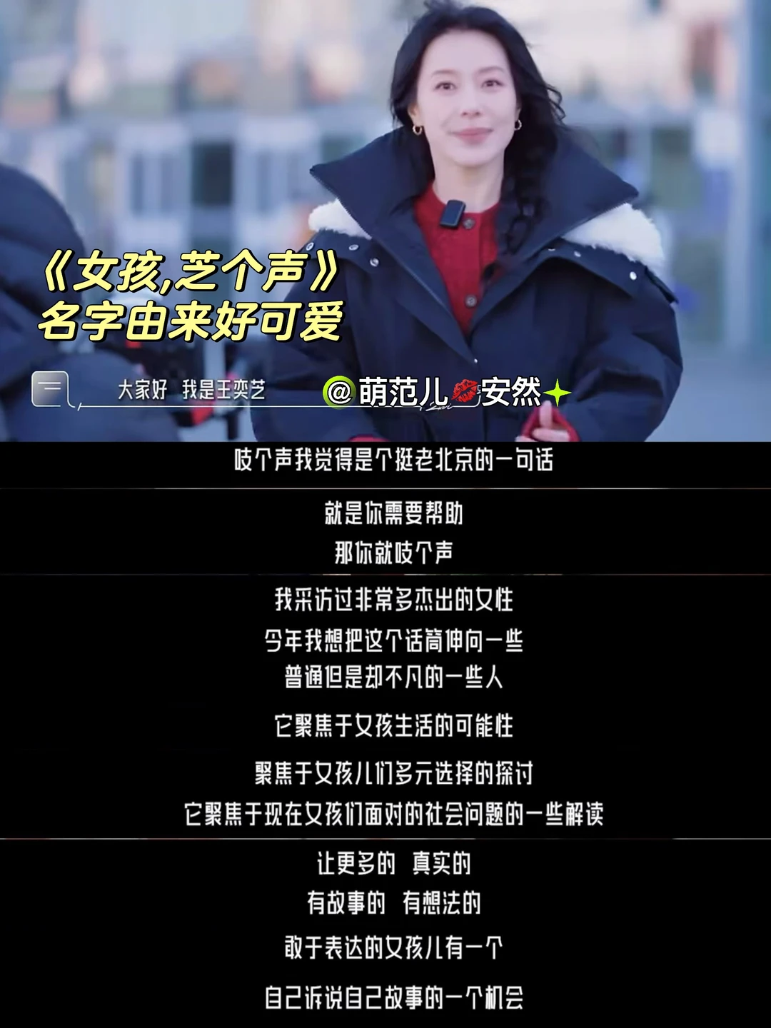 王奕芝说会做这个节目,就是因为她之前在做《不止于他》时,感觉采访过那么多明星,对普通女孩的关注太少。为什么不把目光投注在普通女孩的身上,让这些普通但不平凡的女孩自己为自己发声呢?普通女孩更需要发声,她们的处境更需要被看到。女生们需要被允许,有不同的选择。