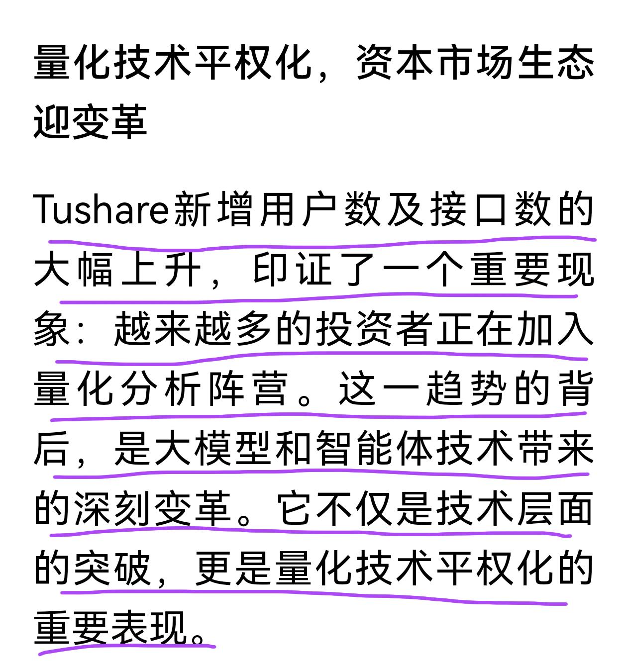 这个事可信吗?财联社报道,大批投资者加入量化阵营,量化技术“平权”化,资本市场生态迎变革。 一个金融数据平台的新增用户数和接口数上升,据报道单日新增用户最高峰值接近4000大关,调用数据的区区4000人,记者就得出大批投资者加入量化阵营的结论,一个AI智能体就能重构量化投资,还要量化技术平权,真的佩服这个记者的勇气。 就想弱弱地问几句: 这AI智能体能达到量化机构模型的技术水平吗? 普通投资者具有融资融券的资金实力和渠道吗? 普通投资者有对冲和套利的风险控制金融工具吗? 普通投资者具有专用服务器等优良的装备,保证委托先人一步吗? 普通投资者具有每秒申报、撤单299次的许可吗? 普通投资者能享受量化机构的交易费用优惠吗? 量化交易不等于盈利,国外量化亏损的大有人在,量化交易不等于都能盈利,你没量化机构的技术和实力,盲目进入量化交易,那只会输得更快更干净。别忽悠普通投资者量化了,还是价值投资更稳妥,各位觉得怎个样?