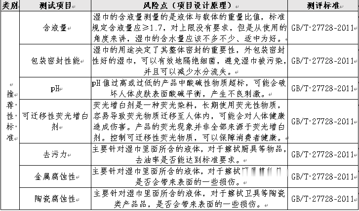 本次比较试验根据消费者的关注点、产品的风险点,相关产品的国家推荐性标准对不同类型的湿巾产品要求等确定测评项目。测评产品执行标准均为:GB/T27728-2011《湿巾》。产品包括三大类:第一类是人体用湿巾,包括卫生湿巾、湿厕纸等,主要考核pH、可迁移性荧光增白剂等与人体皮肤接触的项目,是否符合要求;第二类是厨房用湿巾的性能评价,包括湿巾的去污力,金属腐蚀性等,适用于厨房使用的湿巾的性能要求;第三类是衣物用湿巾,增加陶瓷腐蚀性项目等。具体测评项目见表4。