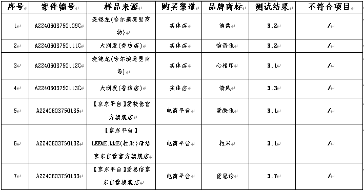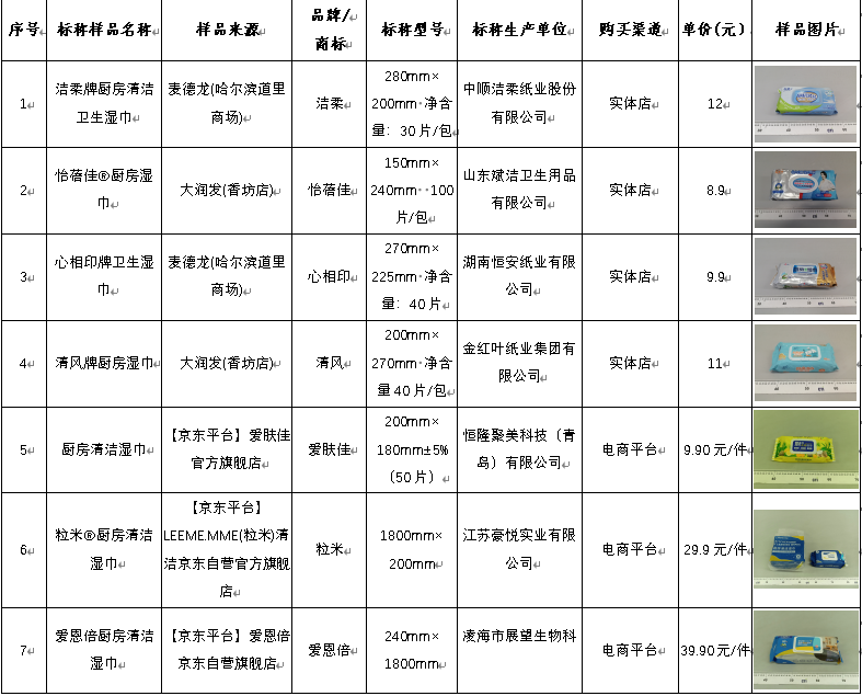 本次比较试验对7款厨房用湿巾产品去污力项目进行了评估,未发现不符合标准要求样品。