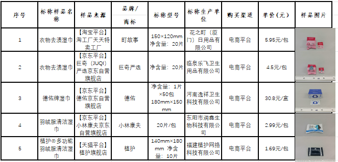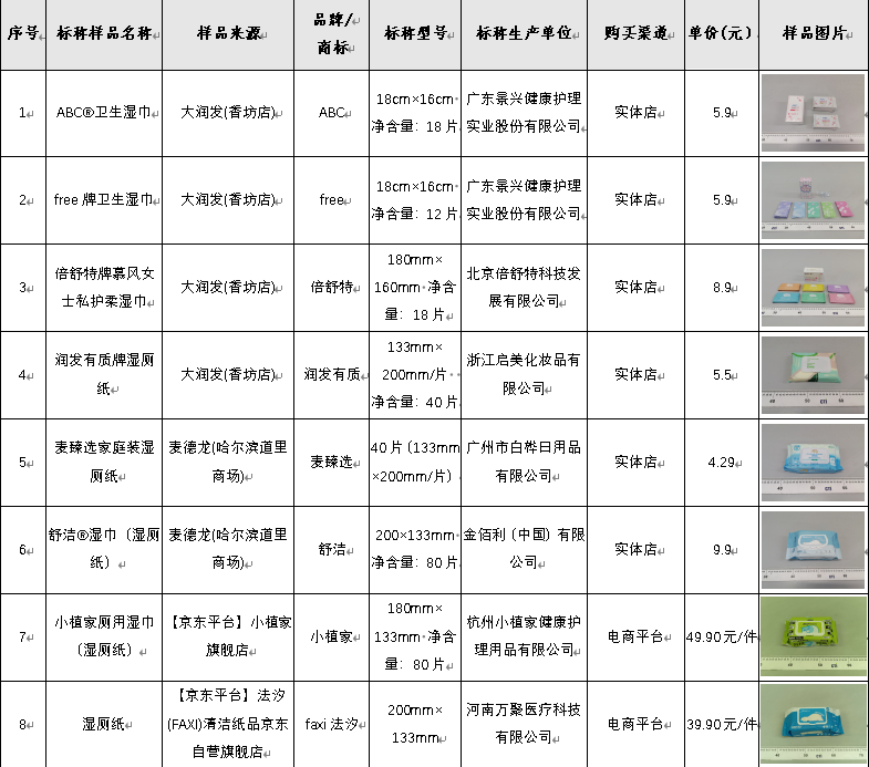 本次比较试验的样品是由哈尔滨市消费者协会、哈尔滨市消费者权益保护中心工作人员以普通消费者的身份,通过哈尔滨市内的商场、超市等实体门店以及网络电商平台购买。湿巾产品共购买了20组样品,其中线上电商平台采购10组,线下实体门店采购10组;根据湿巾的产品类型,产品包括人体用湿巾、厨房湿巾和衣物湿巾三大类,其中人体湿巾产品共购买了8组样品,分为线上电商平台采购2组,线下实体门店采购6组;厨房湿巾产品,共购买了7组样品,分为线上电商平台采购3组,线下实体门店采购4组样品;衣物湿巾产品,共购买了5组样品,全部为线上电商平台采购;样品情况见表1、表2及表3。