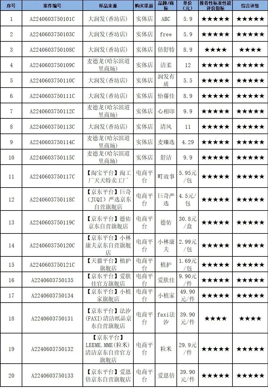 本次比较试验对20款湿巾进行了评估,未发现不符合标准要求。