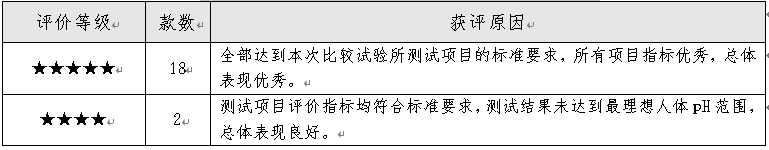 2.总评“五星”为全部达到本次比较试验所测试项目的标准要求,所有项目指标优秀,总体表现优秀;“四星”为测试项目评价指标均符合标准要求,测试结果未达到最理想人体pH范围,总体表现良好。