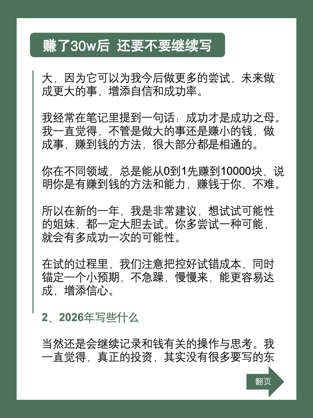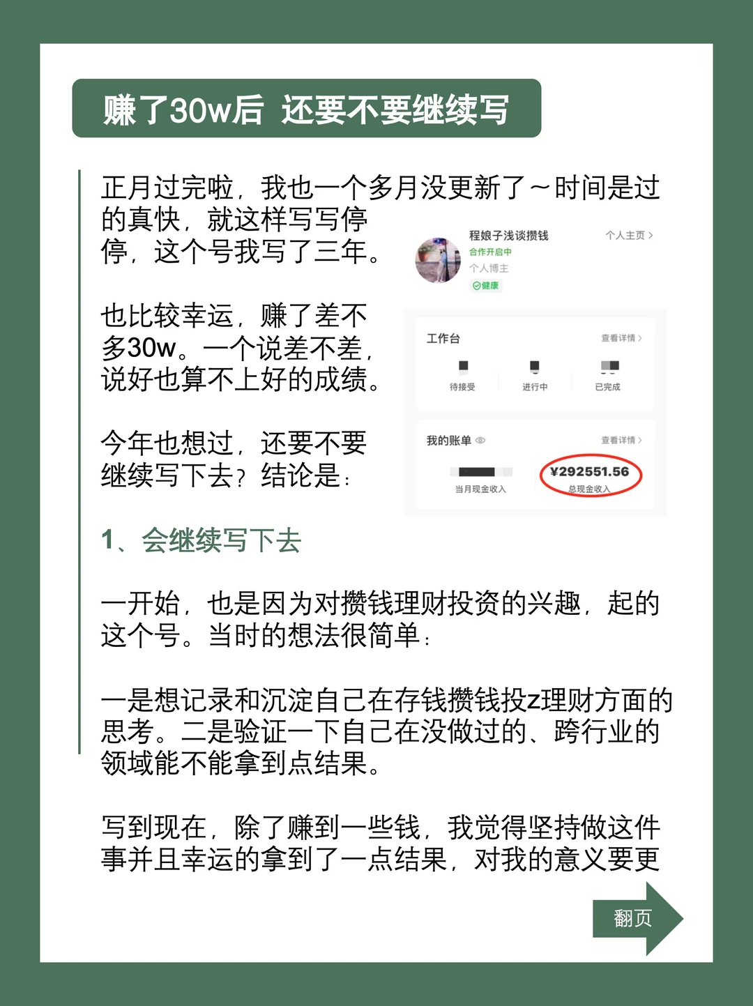 一开始,也是因为对攒钱理财投资的兴趣,起的这个号。想法很简单,一是记录和沉淀自己在存钱攒钱投资理财方面的思考。二是验证一下自己在没做过的、跨行业的领域能不能拿到结果。写到现在,除了赚到一些钱,我觉得坚持做这件事并且幸运的拿到了一点结果,对我的意义要更大。因为它可以为我今后做更多的尝试,未来做成更大的事,增添自信和成功率。