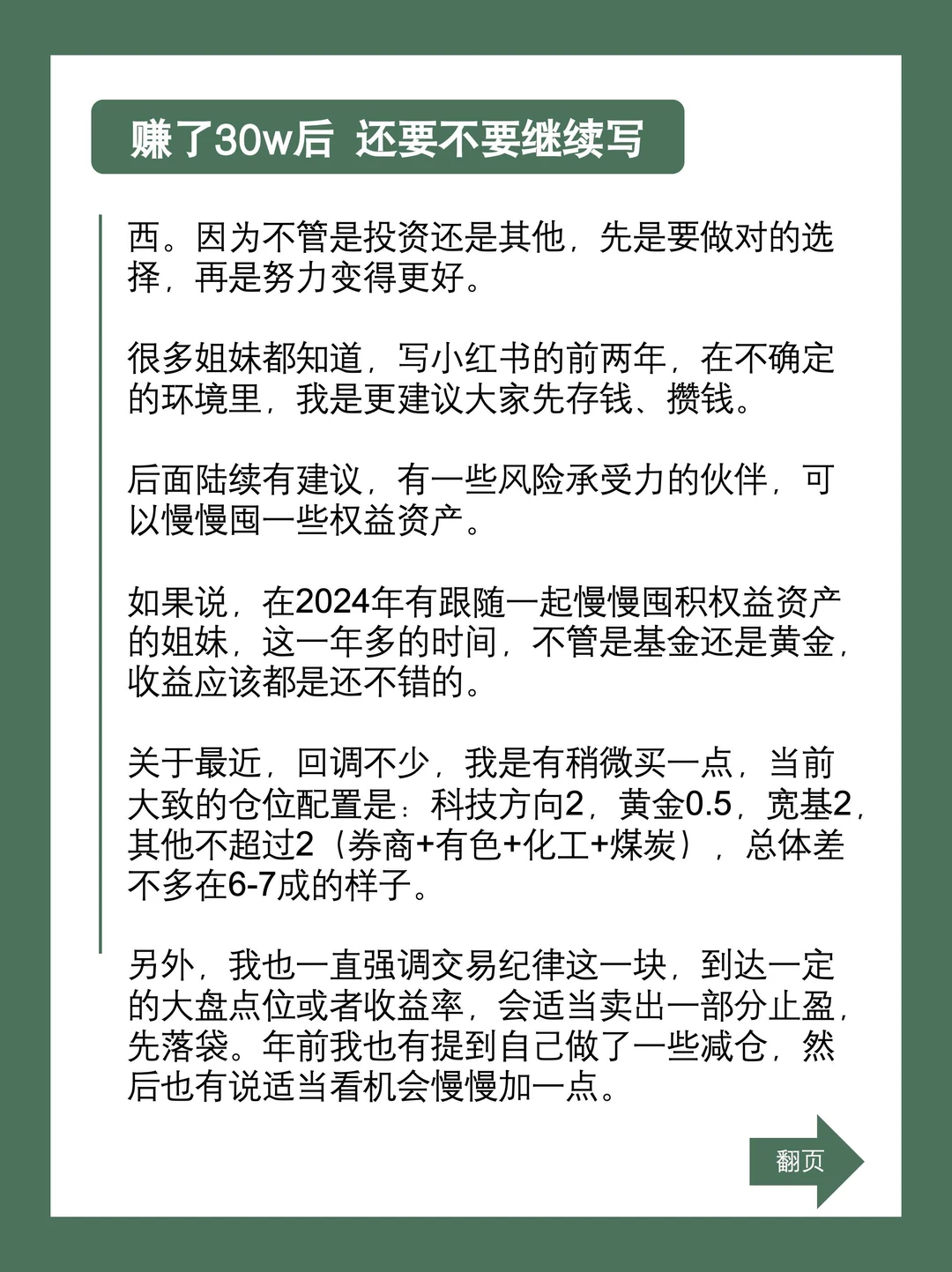 还是会继续记录和钱有关的操作与思考。写的前两年,在不确定的环境里,我是更建议大家先存钱、攒钱。后面陆续建议,有一些风险承受力的伙伴,可以慢慢囤一些权益资产。2024年有跟随一起慢慢囤积权益资产的姐妹,这一年多的时间收益应该都是还不错的。最近回调不少,我买了一些,当前大致的仓位配置是:科技方向2,黄金0.5,宽基2,其他不超过2(券商+有色+化工+煤炭),总体差不多在6-7成的样子。