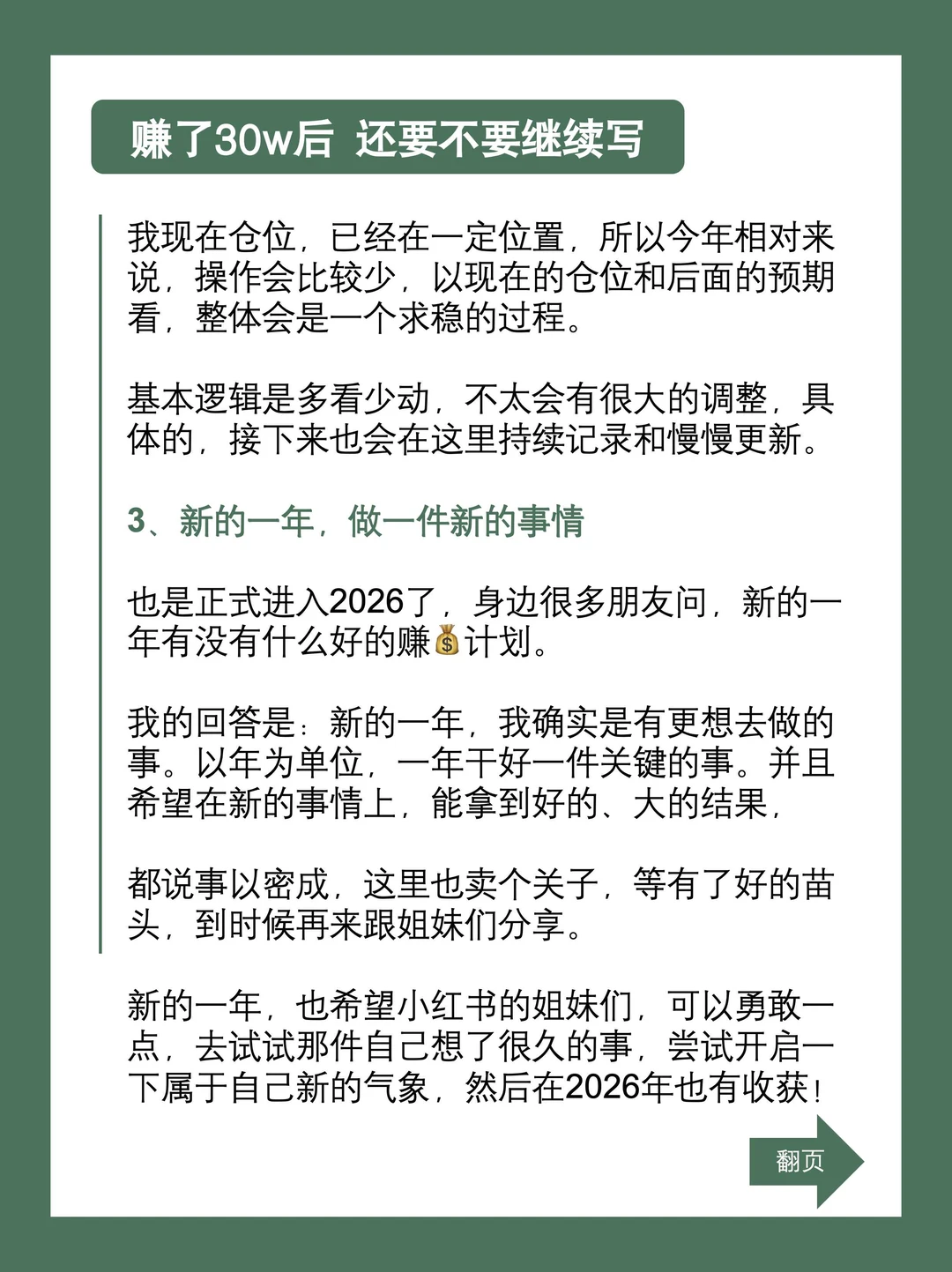 正式进入2026了,身边很多朋友问,新的一年有没有什么好的赚💰计划。我的回答是:新的一年,我确实有更想做的事。以年为单位,一年干好一件关键的事。希望在新的事情上,能有好的大的结果。