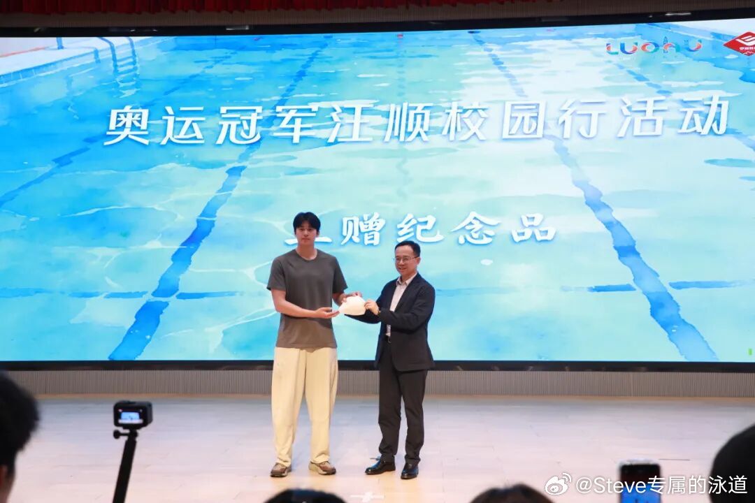 以礼相赠,情暖校园;以心相交,共赴美好。交换礼物环节,汪顺将亲笔签名的国家队泳帽赠予罗湖区,罗湖区人民政府副区长詹辉则代表罗湖区,向汪顺回赠了一份独具匠心的礼物——由罗湖区非遗传承人精心设计制作的景泰蓝掐丝珐琅画。画作以“一帆风顺”为主题,寓意着乘风破浪、前程似锦,画背印制的藏头诗更是将汪顺的名字与拼搏精神巧妙融合,用非遗匠心致敬奥运健儿,以诗意祝福礼赞永不言弃的体育精神。