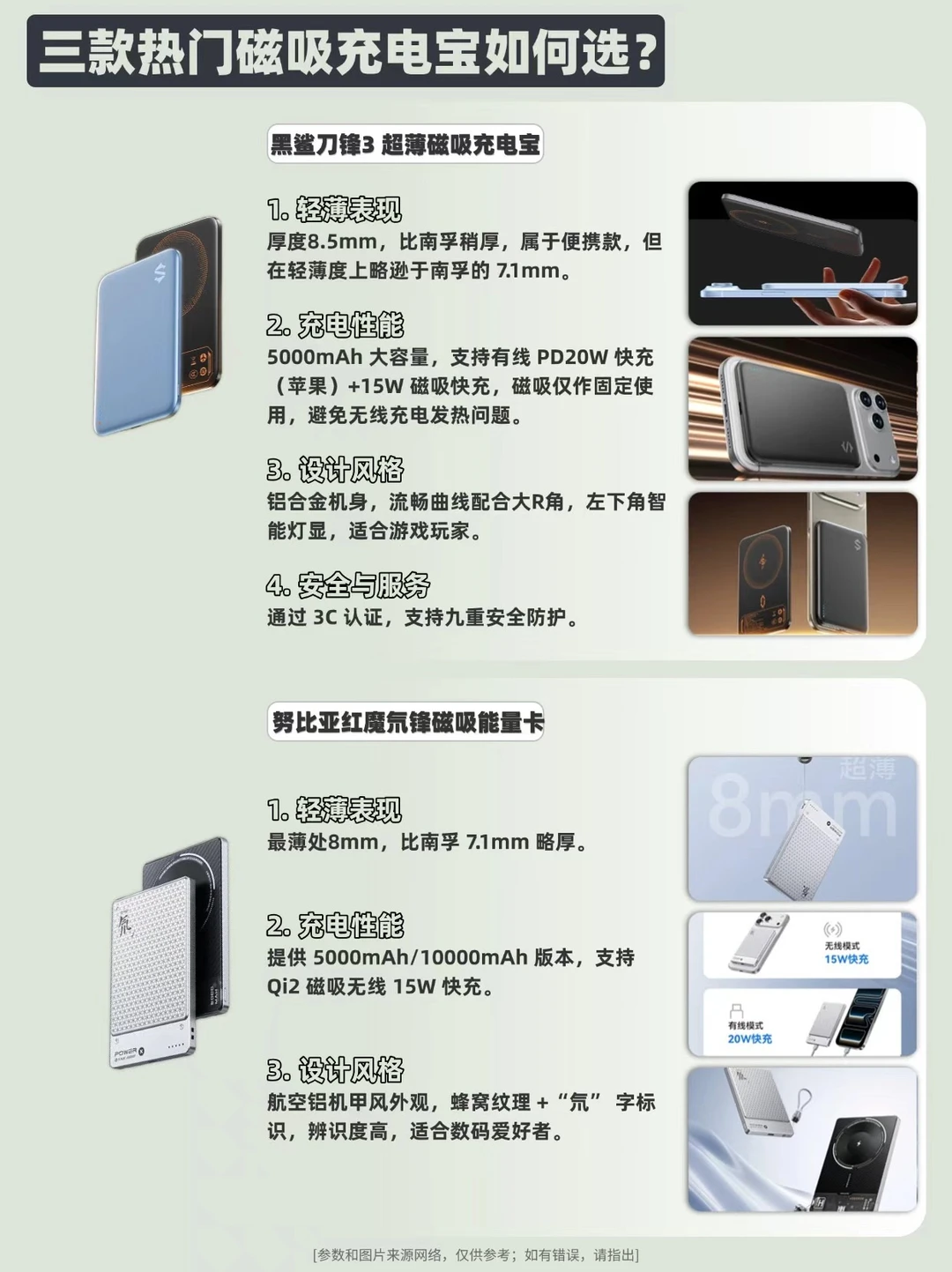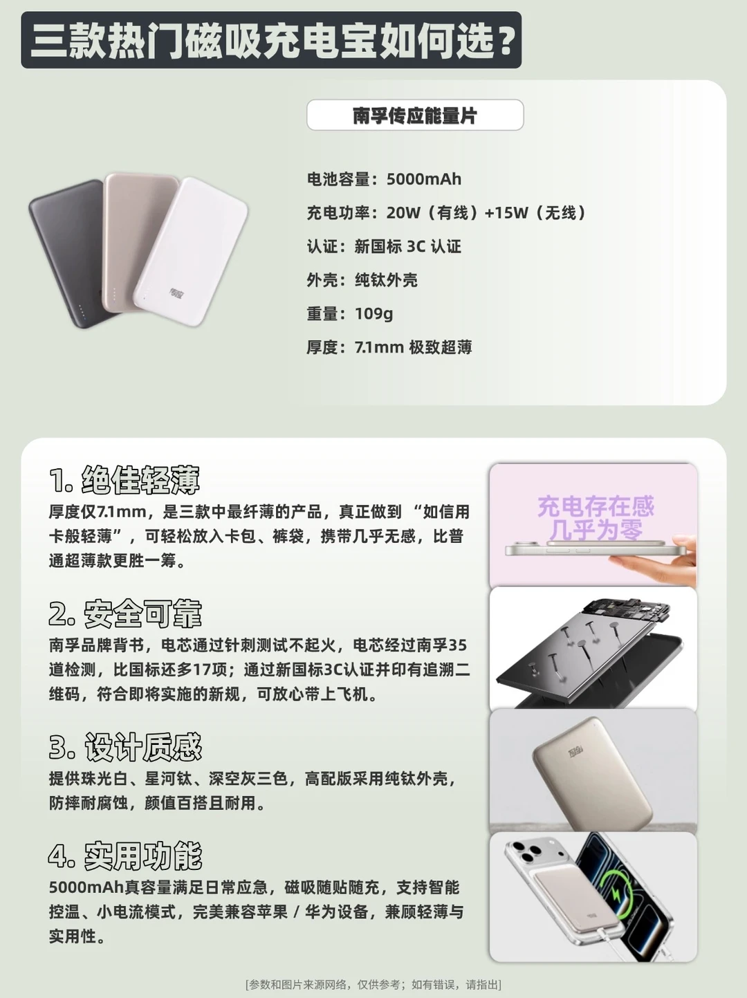 要说外出时离不开的配件,那小陈肯定要投超薄磁吸充电宝一票,可以告别线材束缚,往手机背后一贴就能回血,出门轻便不少。市面上也涌现出不少把“轻薄”做到极致的产品。