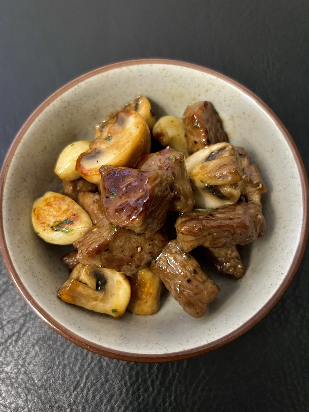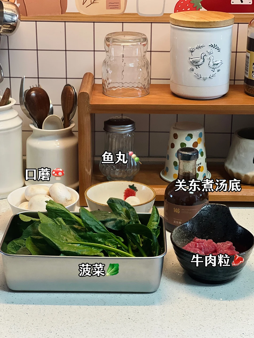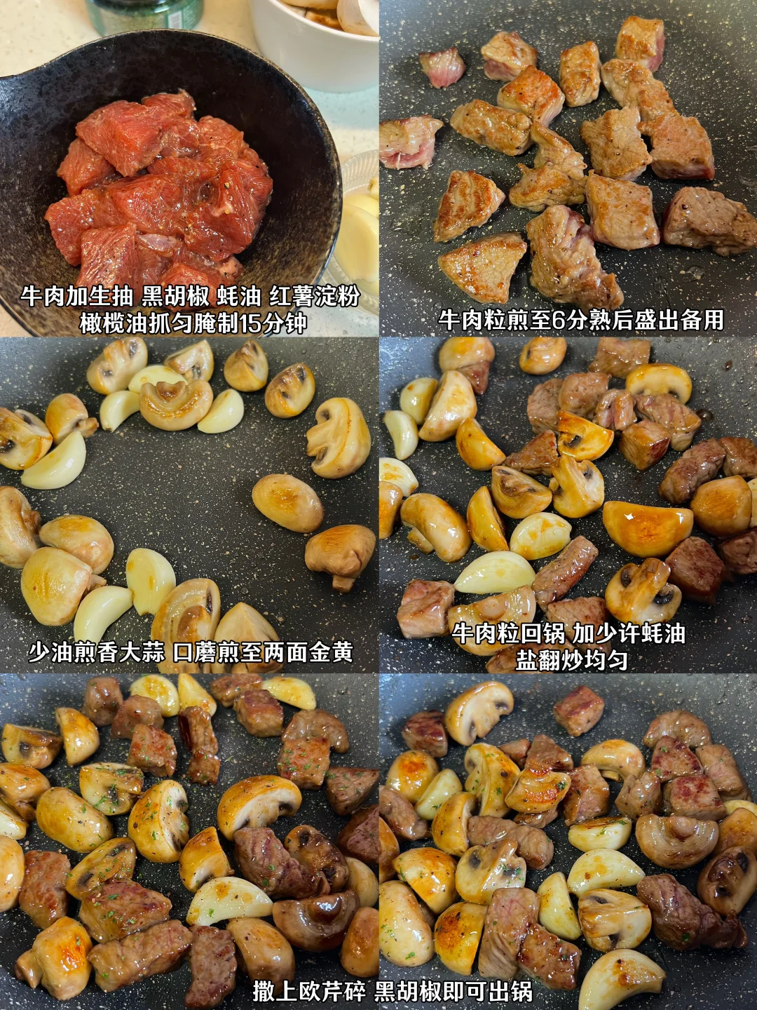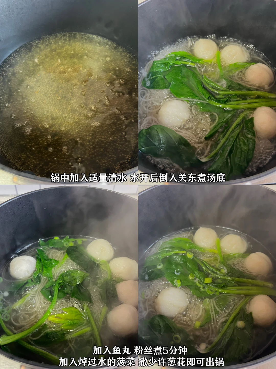 做法在后面图片里哦! 鱼丸菠菜粉丝汤用了关东煮汤底来煮 没有油没有复杂的调味 喝起来鲜美爽口又低卡 口蘑吸满了大蒜和牛肉粒的汤汁 外表焦香一口,爆汁 又是好吃又低卡的一餐