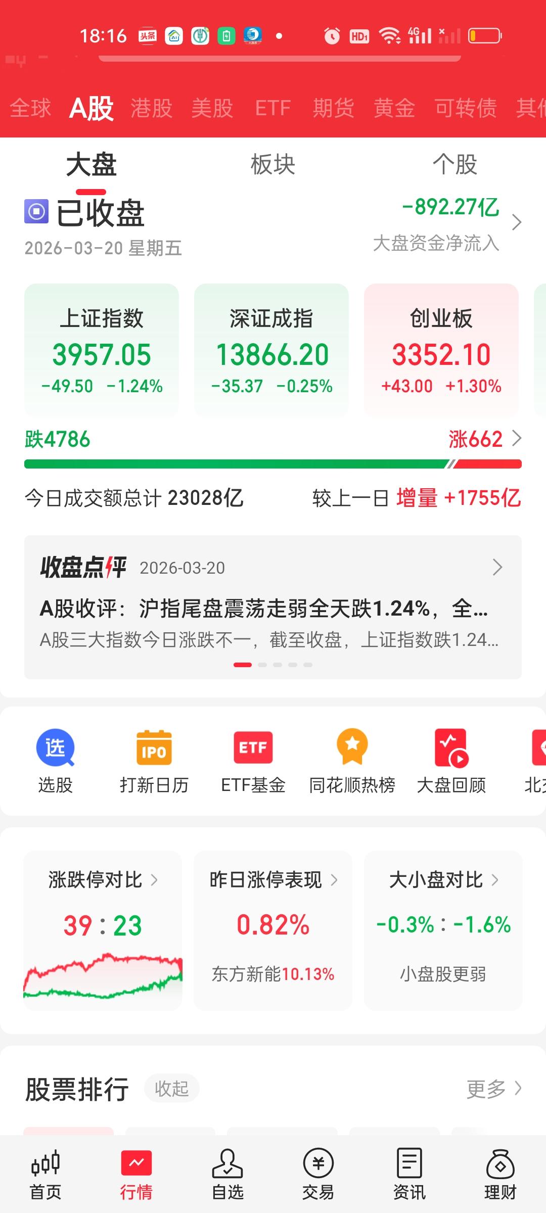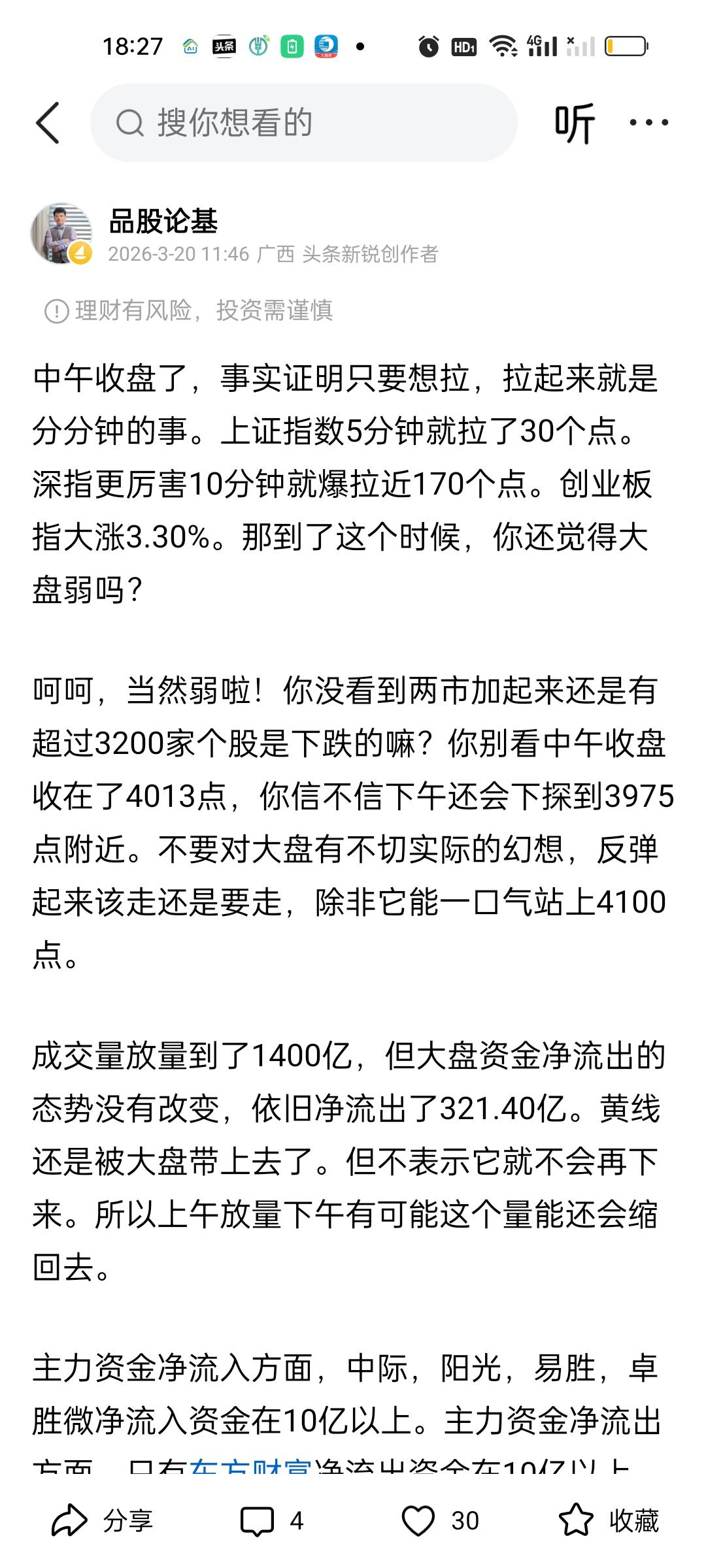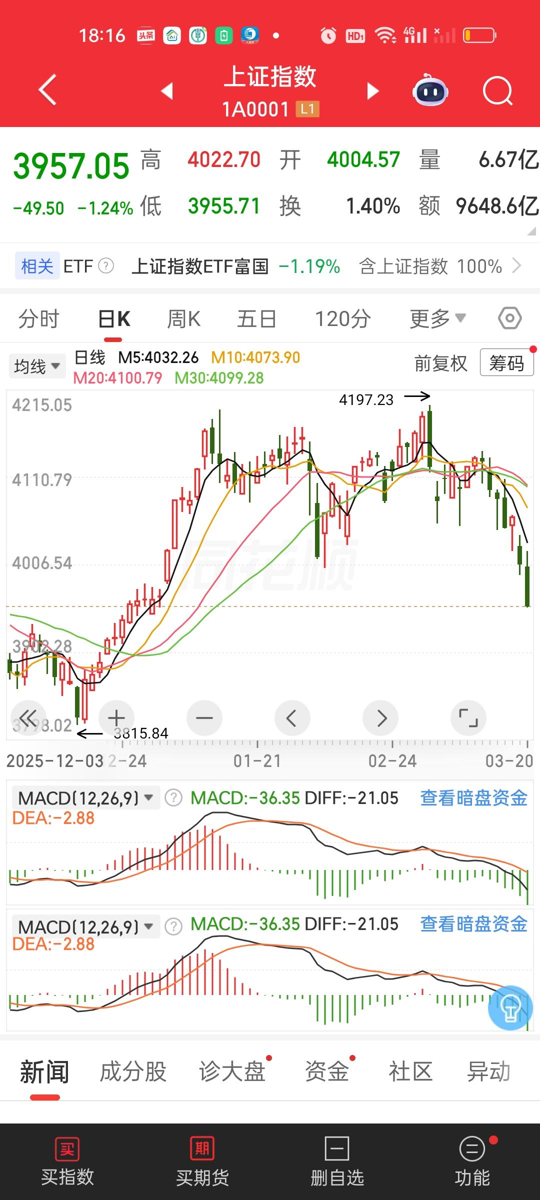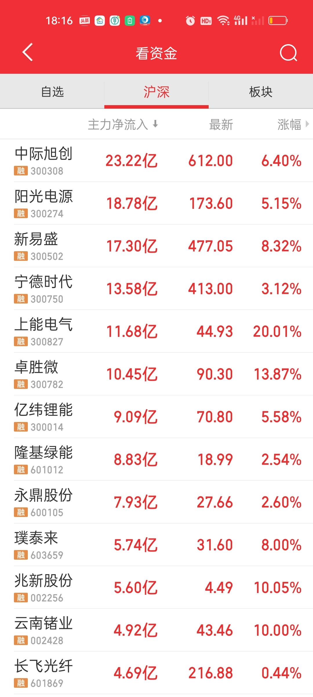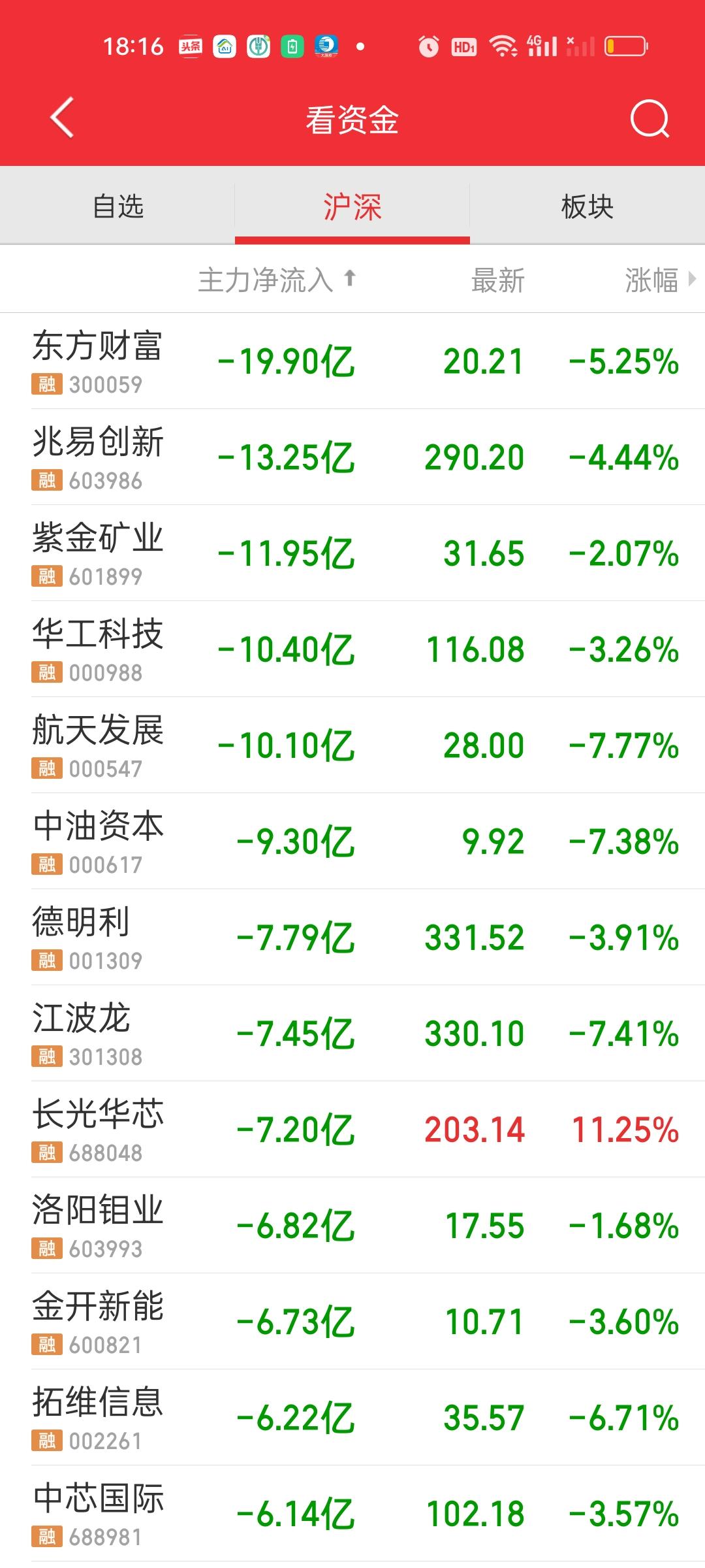 收盘了,可以说又是血雨腥风的一天。上午成交量放量1391亿,全天放量1755亿,但上午大盘资金只净流出了321.40亿,全天大盘资金净流出892.27亿。这就说明下午成交量放量了1755-1391=364亿,大盘资金净流出了892-321=571亿。 最致命的是收了一根光脚阴线,也就是说下午收盘几乎收在了日内最低点,也就说除非周末两天有特别大的利好,否则下周一开盘还会惯性低开,还会继续往下杀。这对信心的打击,对情绪的打击都会十分致命! 中午收盘收在4013点,中午收盘时我就说过了,趁着反弹要减仓,不要对大盘抱有不切实际的幻想。指数下午还会继续下杀到3975附近,反弹起来该走还是要走,不要反弹了你又不走了,结果指数下杀幅度比我预想的还要深。甚至已经杀破位了。 主力资金净流入方面,净流入资金超过10亿的个股又增加了宁德时代和上能电气。主力资金净流出方面,净流出资金超10亿的个股增加了兆易创新,紫金矿业,华工科技,航天发展。