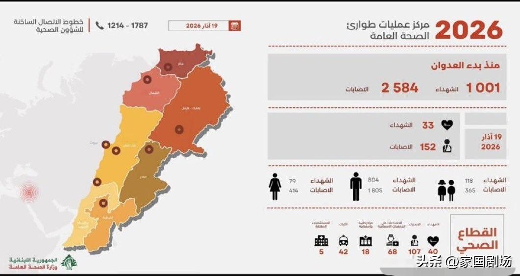 黎巴嫩卫生部3月19日公布的官方数据显示,自以色列发动袭击以来,至少已有1001人死亡,2584人受伤。