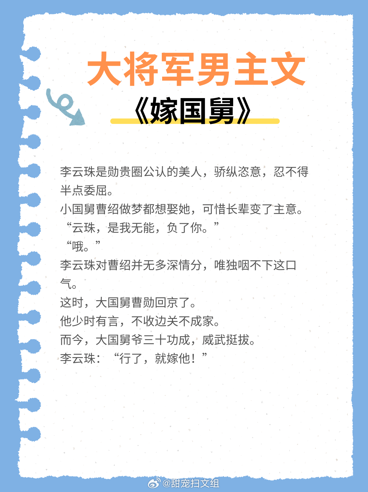 大将军男主文,冷面战神,金戈铁马,意气风发,战功赫赫!1、《嫁国舅》 作者:笑佳