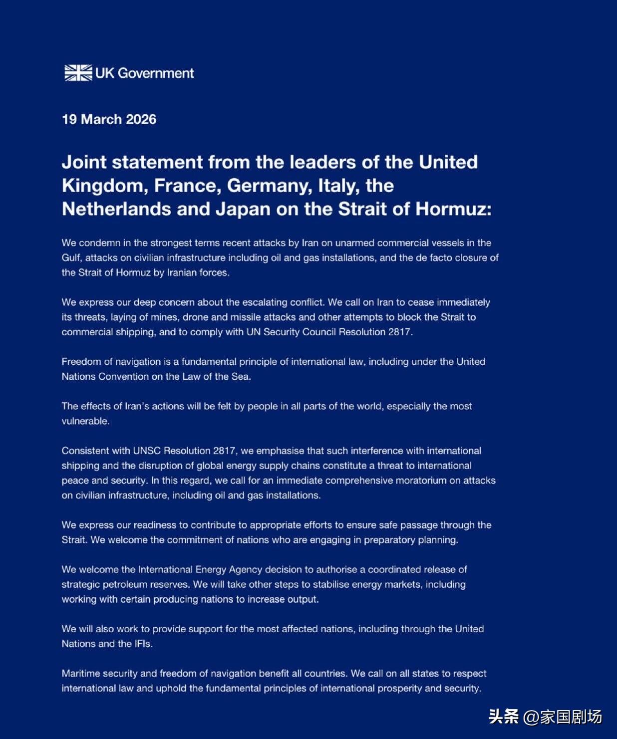 各国领导人谴责伊朗袭击商船和油气基础设施,并呼吁伊朗停止针对航运的采矿、无人机和导弹活动,称能源供应链中断“对国际和平与安全构成威胁”。