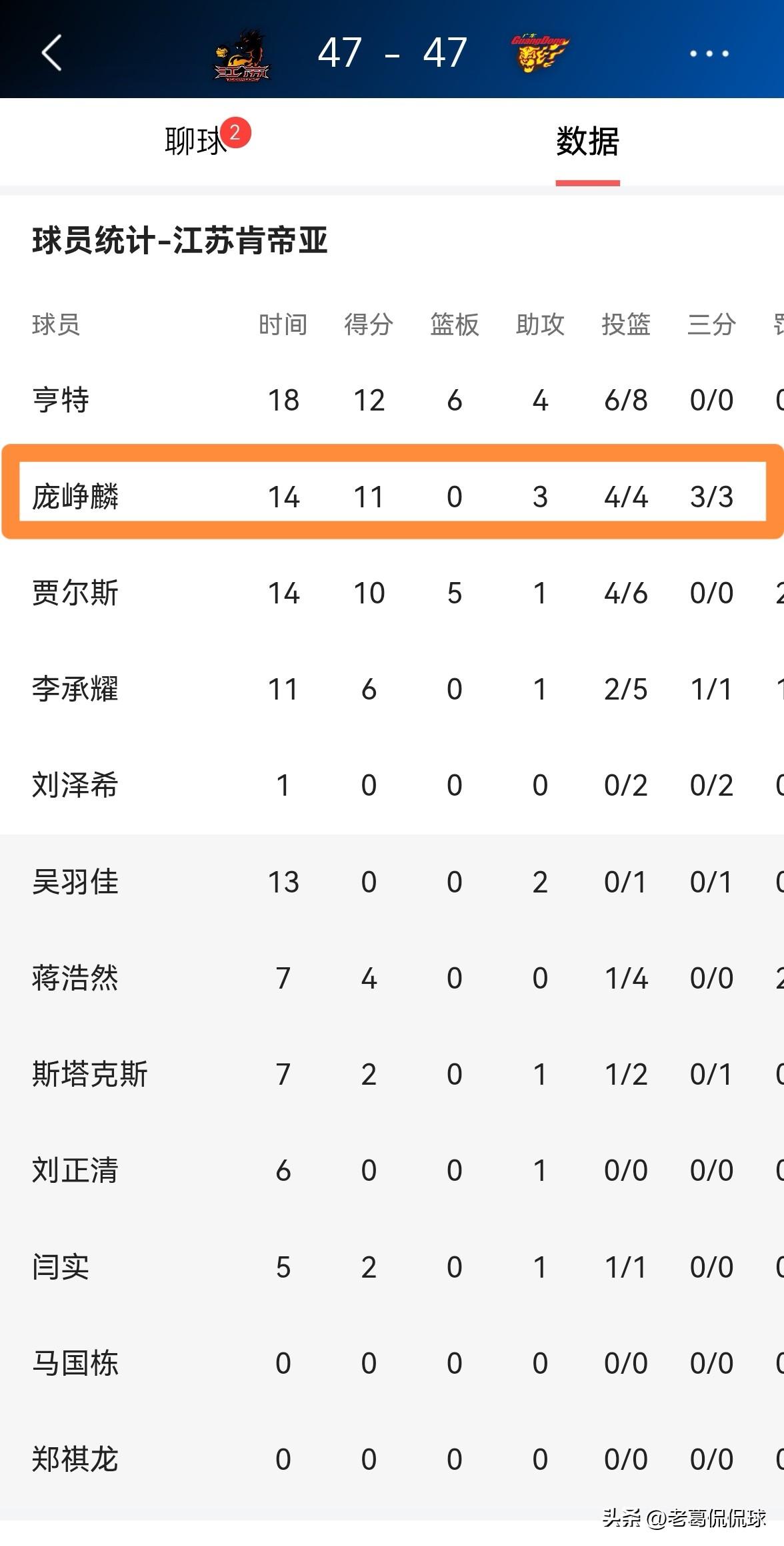 江苏肯帝亚当家后卫庞峥麟的进攻效率真是太高了!在今天江苏肯帝亚主场迎战广东东阳光的比赛中,目前双方半场战罢,江苏肯帝亚和广东东阳光战成了47平。值得注意的是,在前两节比赛中,庞峥麟在进攻端打出了极其高效的表现,他在首发出战的14分钟里,投篮4中4,其中三分球3中3特别高效的砍下11分,还有3助攻,没有出现任何的失误,他的场上正负值为+2。 庞峥麟不愧是当今CBA最炙手可热的新星之一,他在进攻端确实拥有极高的天赋。