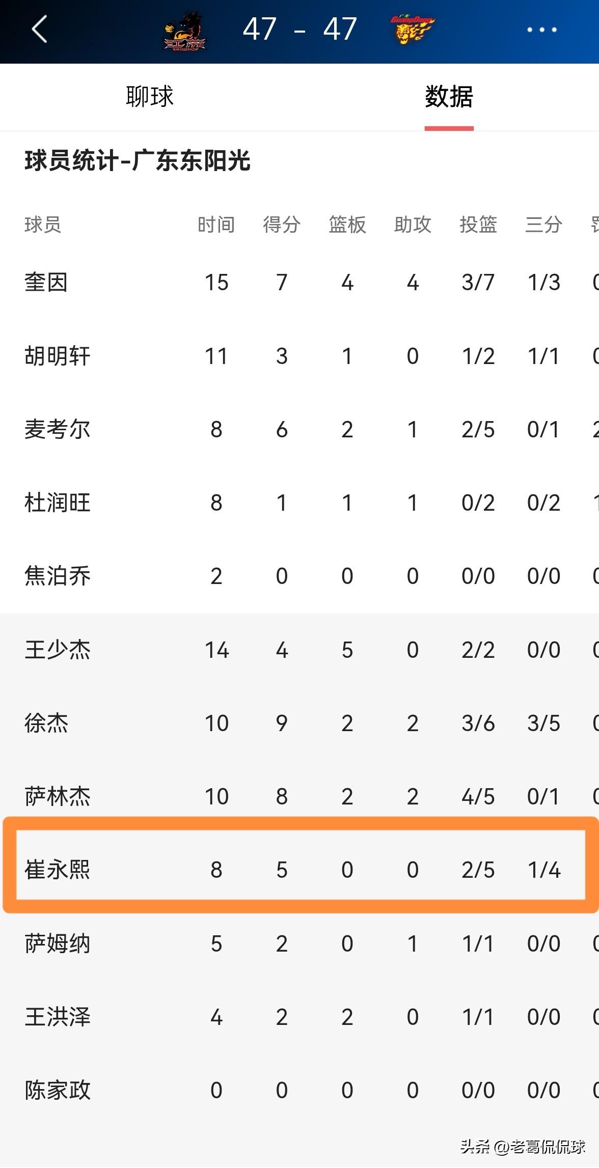 谁能拯救一下广东东阳光球星崔永熙的三分球?在今天广东东阳光客场挑战江苏肯帝亚的焦点战中,目前双方的上半场比赛已经结束,两队战成了47平。在前两节比赛中,崔永熙在三分线外的表现非常低迷,他在替补出战的8分钟里,投篮5中2,其中三分球4中1得到5分,他的场上正负值为-1。 坦白说,如果崔永熙能够不断的增强自己的三分投射能力,那么崔永熙一定会成为广东东阳光的一把利器。
