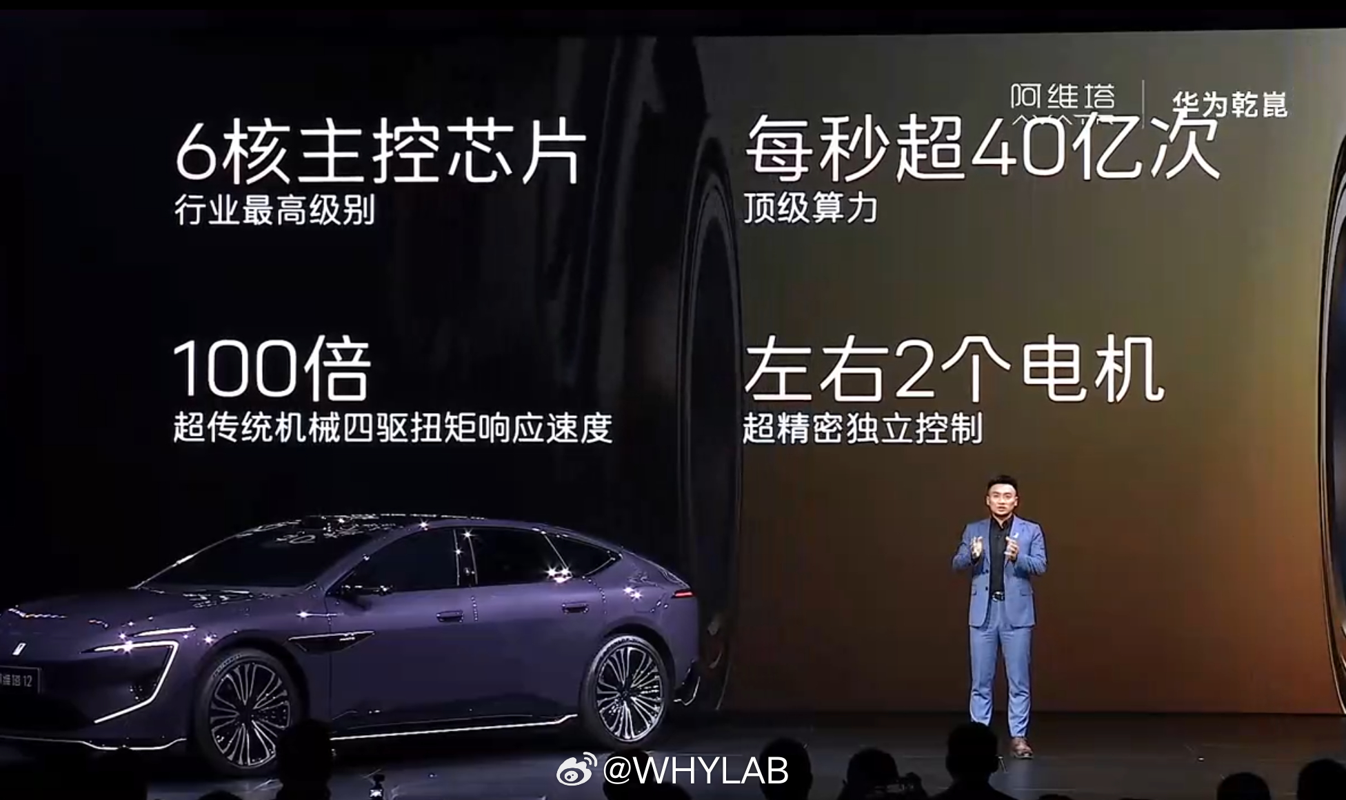 新阿维塔 12 搭载了行业最高级别 6 核主控芯片,每秒超 40 亿次顶级算力,超过传统机械四驱的 100 倍扭矩响应速度。