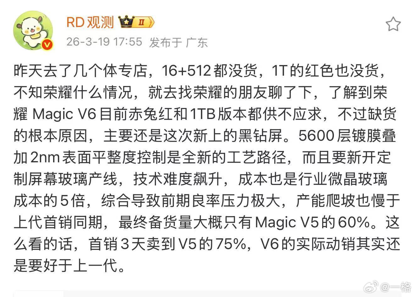 荣耀Magic V6首销表现不错,赤兔红和大内存版本都卖断货了。原因也不复杂:想买的人多,再加上黑钻屏这种复杂工艺本来就难做,成本高,前期产能跟不上爆发的需求,属于正常现象。 但你别说,复杂工艺还真不是白给的。我用着感觉屏幕摸起来就是舒服,观感也讨喜,属于你越用,越能发现它好的那种。