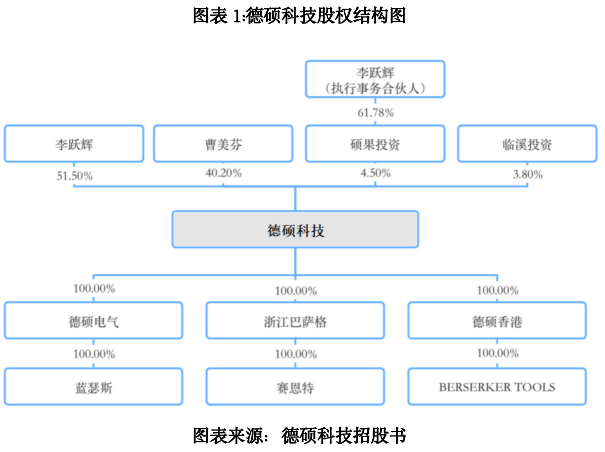 招股书显示,截至招股说明书签署日(2025年12月22日),李跃辉直接持有德硕科技51.50%的股份,通过员工持股平台永康市硕果股权投资合伙企业(有限合伙)(下称“硕果投资”)间接控制该公司4.50%的股份,合计控制该公司56.00%的股份。目前,李跃辉担任德硕科技的董事长、总经理,为德硕科技的法定代表人。