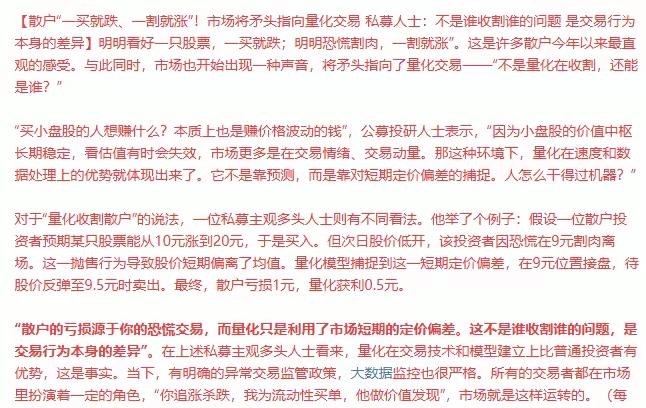 金融法草案公开征求意见,支持中长期资金入市 增强资本市场内在稳定性,那我的意见是对量化金融监管力度要加强!一旦量化基金规模逐渐放大,成为市场的主导者。那么,一旦量化基金进入中小盘股,散户基本上会沦为被割韭菜的局面!因为很多散户做不了中长期的投资,一亏钱基本上就割肉离场,而量化基金量化机构高频的交易散户基本上就是亏钱!散户亏钱量化机构就赚钱,也就是说,散户亏一块钱量化基金机构就赚五毛!量化机构用的是超算法高频速度的交易闪付,拼手速,拼资讯什么都拼不过,而且机构量化交易t+0,散户只能隔天才能卖,散户更没有资金优势!