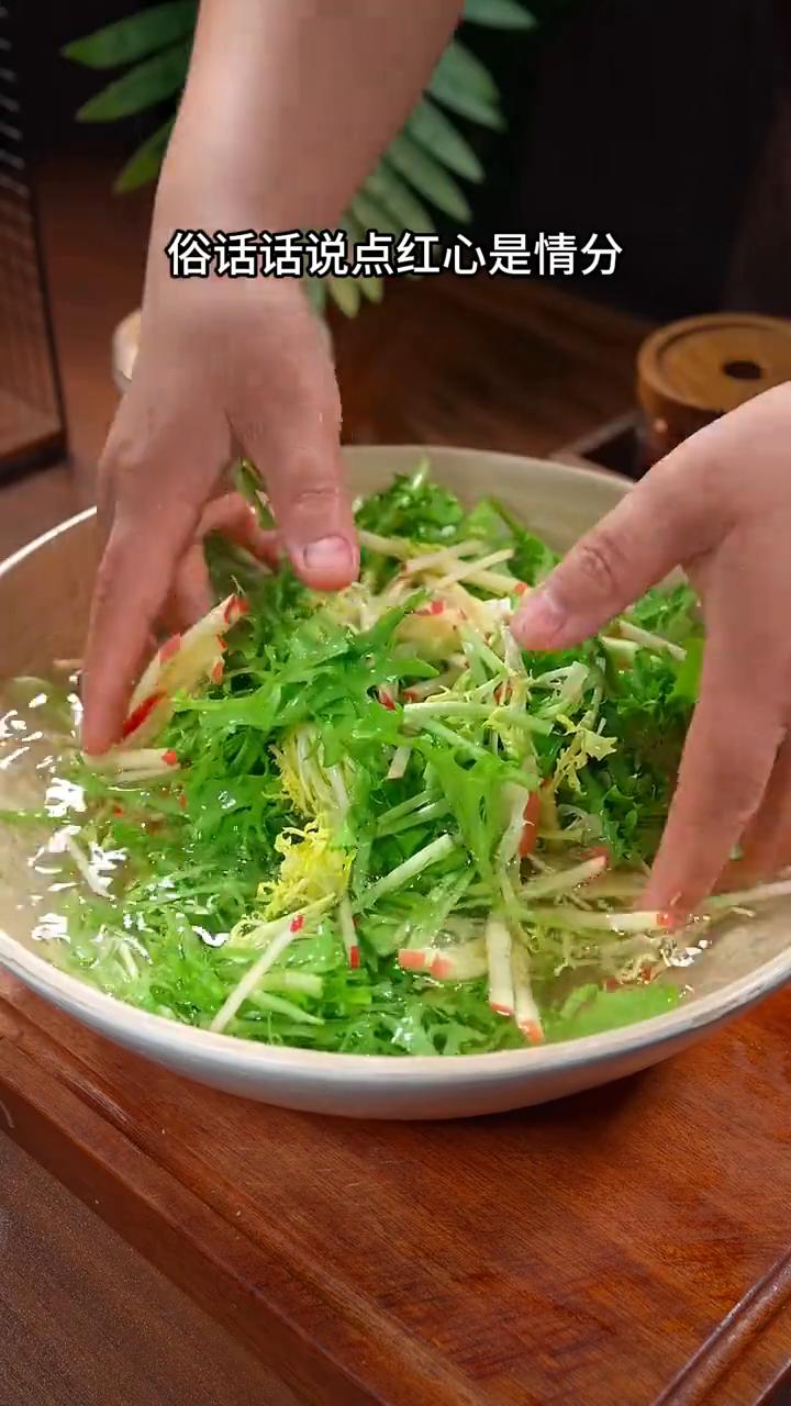 苦菊新吃法。 姐妹们,为了夏天能穿上美美的裙子,我决定每天都吃这道苦菊拌苹果。这道菜寓意着苦尽甘来,清脆爽口,好吃又解腻。 ·首先把三毛钱一斤的苦菊切成均匀的小段,然后把苹果切成大片,再切成均匀的细丝,收入到大碗中。 ·接着加一勺食盐,倒入清水先浸泡十分钟。盐水能彻底洗去苦菊里的残留杂质,还能保留苹果的脆感,避免氧化发黑。 ·泡好后控干水分,淋一勺香油增香。好吃的灵魂就是撒上亚麻籽芝麻盐,它里面有白芝麻、奇亚籽、低钠盐,还有亚麻籽,没有乱七八糟的添加,都是大厨用小火慢炒研磨而成。平时用来做各种凉拌菜,谁煮菜都很好吃。 ·最后用手抓拌均匀就可以开吃了。 马上就夏天了,注重饮食的姐妹们赶紧收藏做起来。