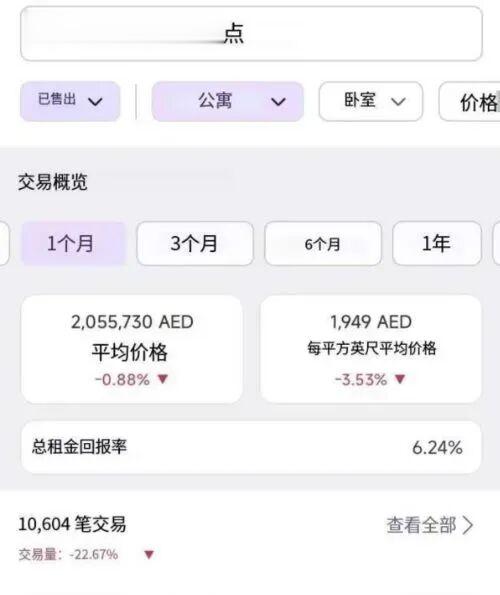 但每经记者从阿联酋头部房产数据与市场情报平台propertymonitor获取的数据显示,迪拜过去一个月(2月16日—3月17日)公寓的成交笔数为10604笔,同比下滑22.67%。公寓的平均价格为2055730AED(阿联酋迪拉姆,下同)/套(约合人民币385.6万元/套),同比下跌0.88%;每平方英尺平均价格为1949AED(约合人民币3.94万元/平方米),同比下滑3.53%。