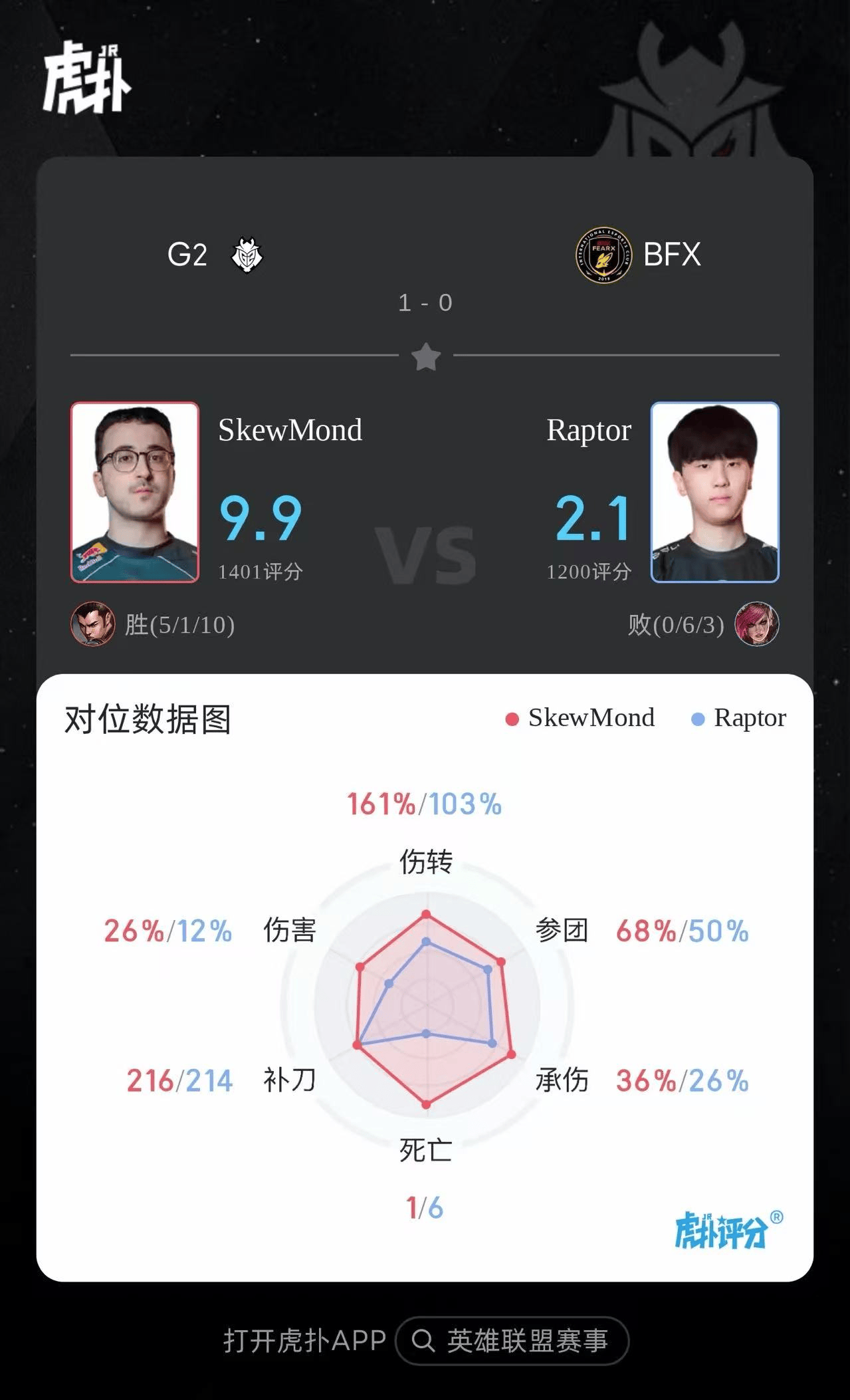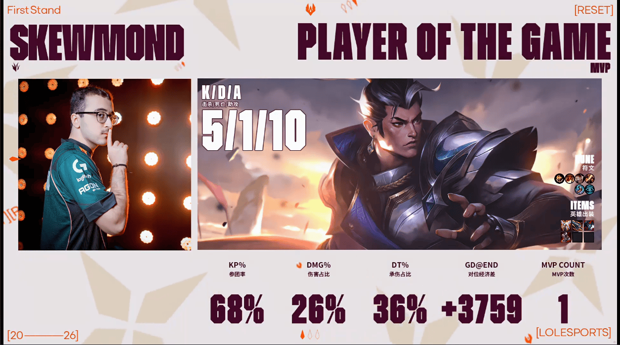 虎扑03月20日讯SkewMond赵信打出5/1/10战绩,斩获G2对阵BFX第一局MVP