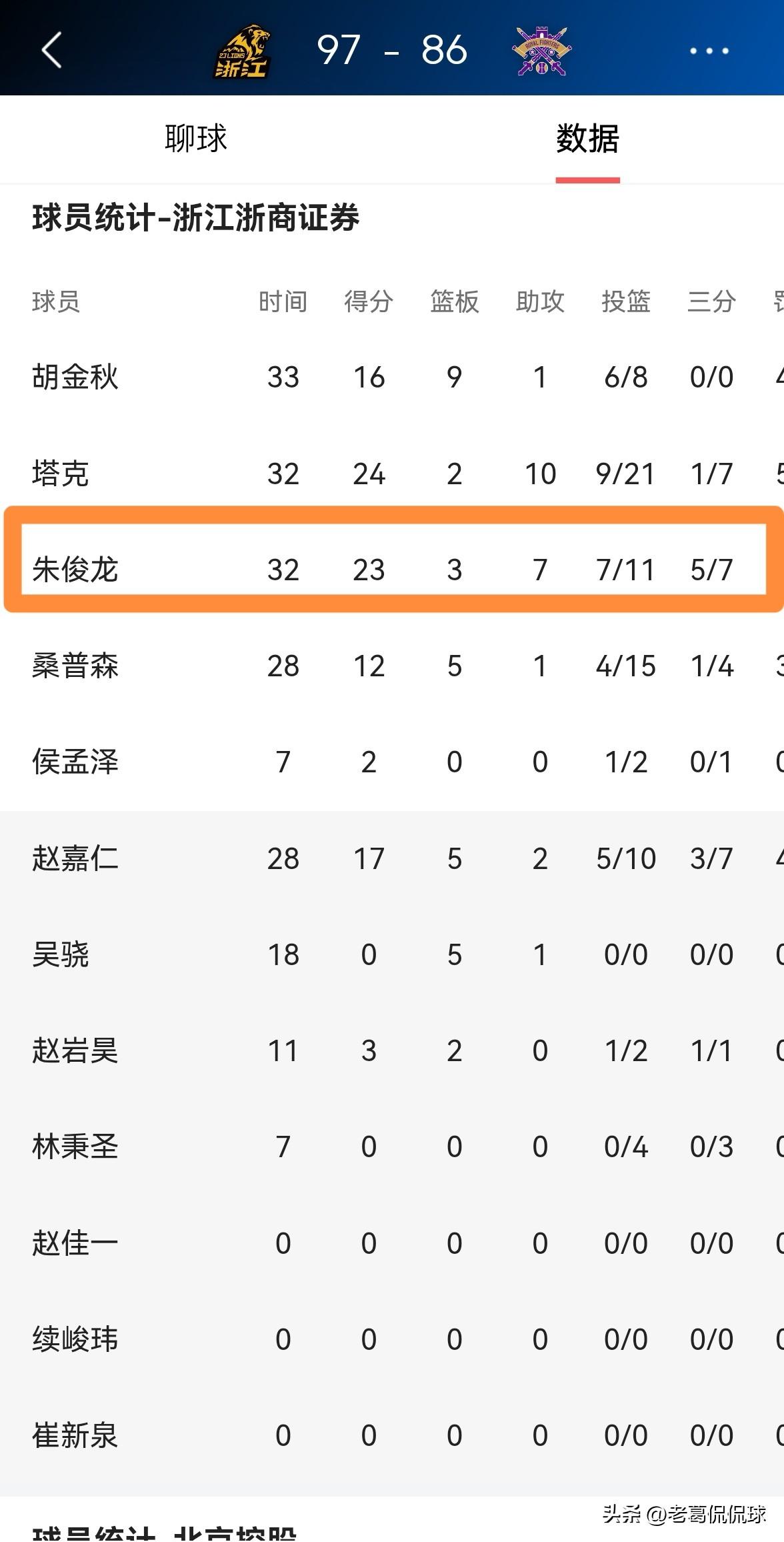 我必须要大赞浙江浙商证券大将朱俊龙!在今天浙江浙商证券主场以97:86战胜北京控股的比赛中,朱俊龙不仅在三分线外神准,而且在防守端一如既往的表现出色,他绝对是球队能够获胜的大功臣。 整场比赛下来,朱俊龙首发出战32分钟,投篮11中7,其中三分球7中5、罚球4中4非常高效的砍下23分,外加3篮板7助攻,他的场上正负值为+23。 坦白说,本场比赛朱俊龙出了三分投篮和防守出色外,他还送出了7次助攻,这真是让人感到特别惊喜。