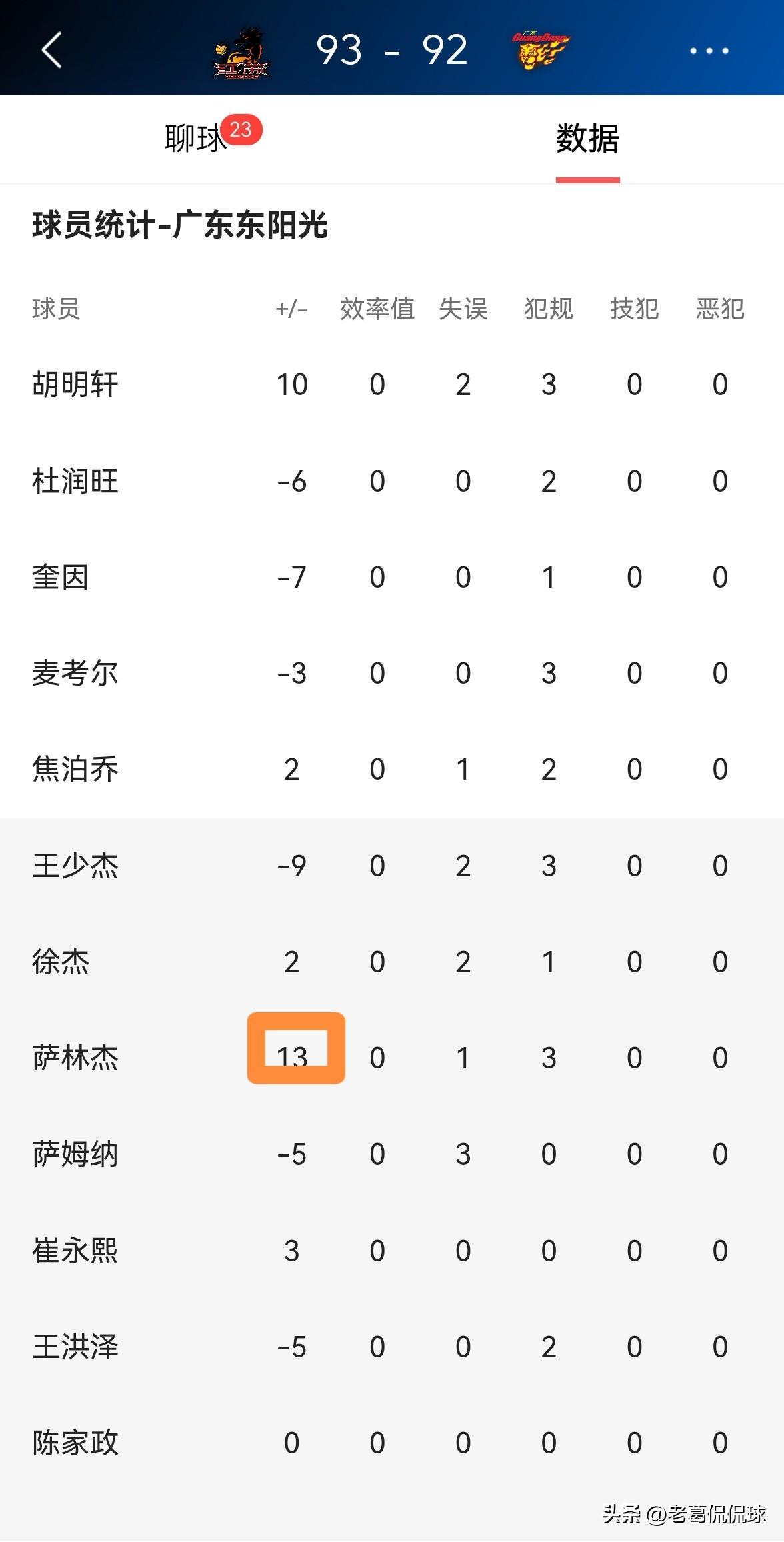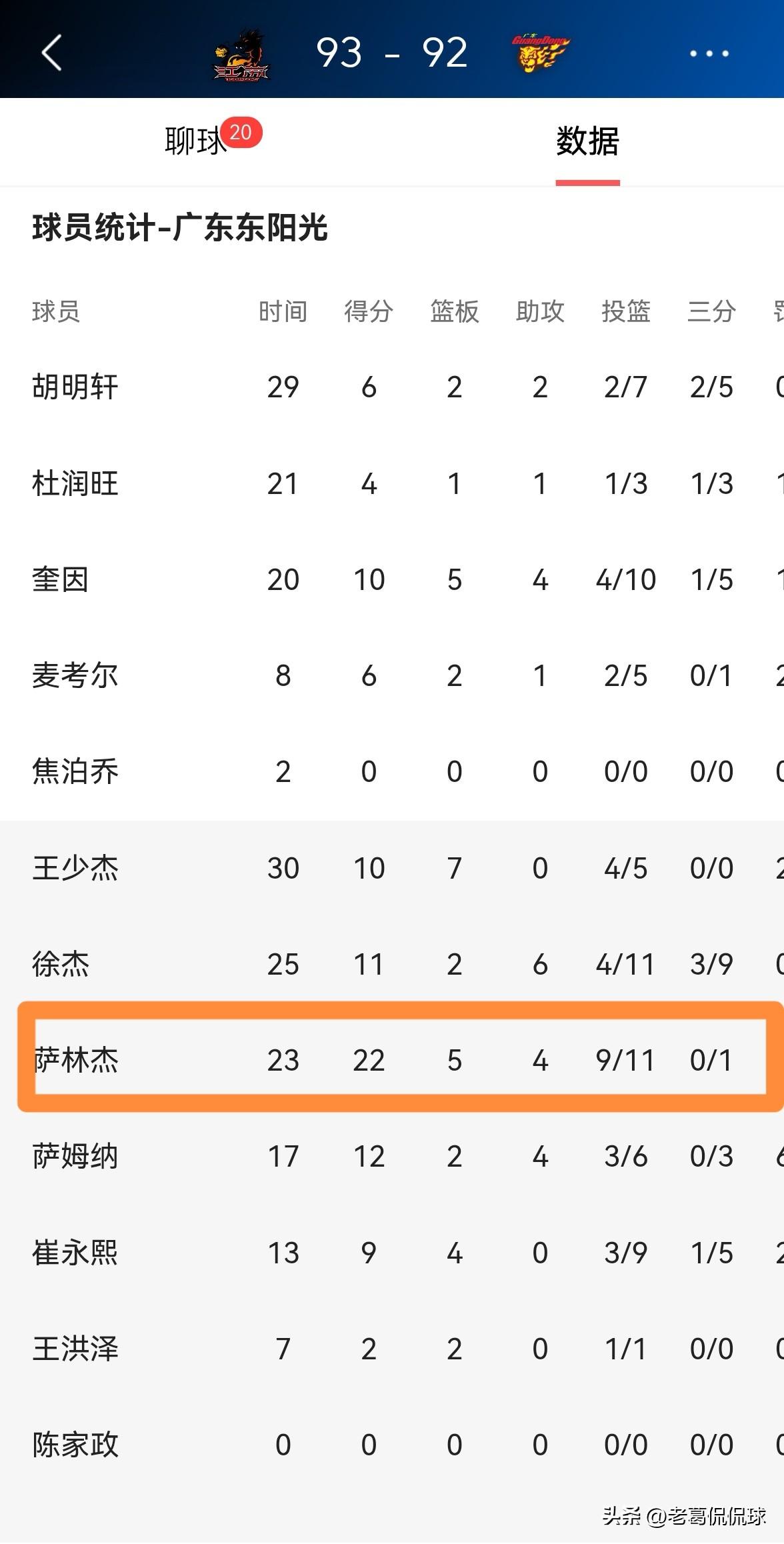 广东东阳光外援萨林杰真是虽败犹荣!虽然今天广东东阳光在客场以92:93惜败于江苏肯帝亚,但是老将萨林杰的表现却非常的出色,他在替补出战的23分钟里,投篮11中9,其中三分球1中0、罚球6中4非常高效的砍下22分,还有5篮板4助攻,他的场上正负值为球队最高的+13。 实事求是的说,如果杜峰教练能够多给萨林杰五分钟的上场时间,我相信广东东阳光绝对不会以这样窝囊的方式输掉比赛。