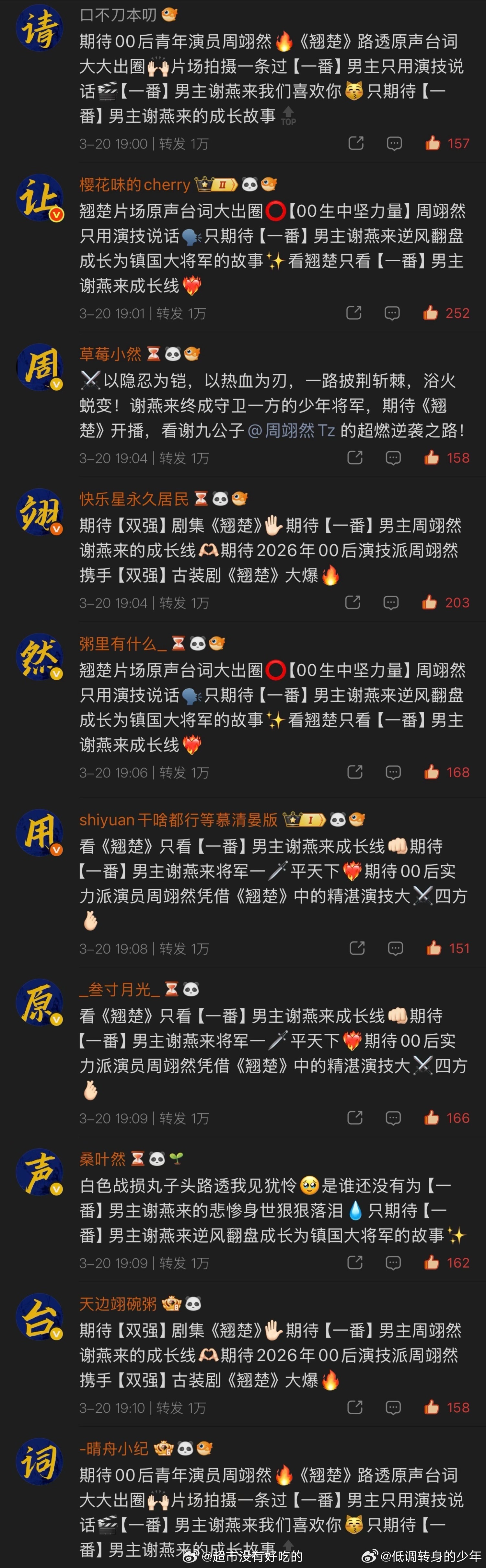 周翊然翘楚周翊然粉丝《翘楚》热🧱排字来了,要求周翊然角色谢燕来要原声台词 !记