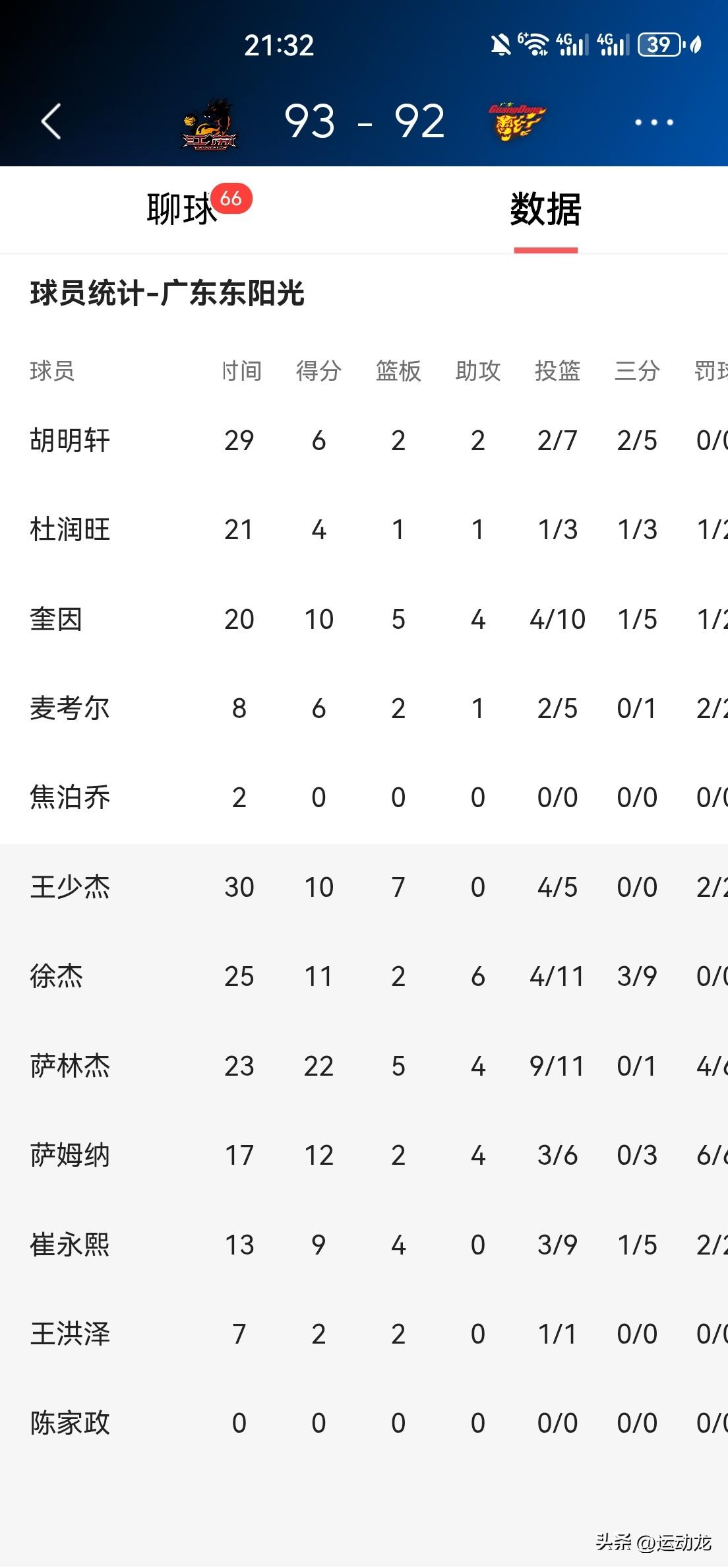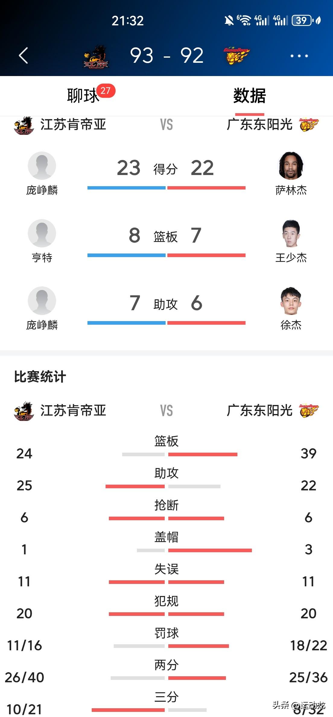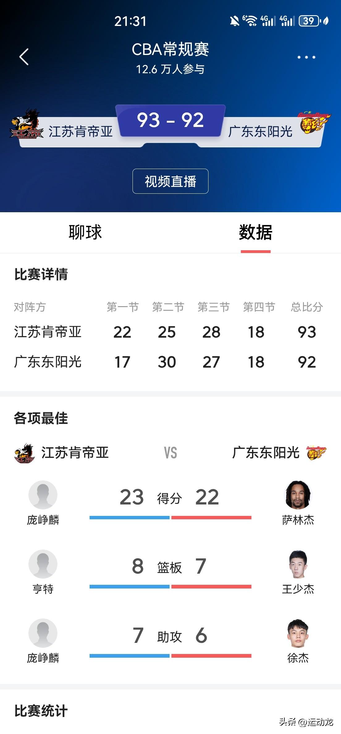 广东宏远继续沉沦,客场不敌弱旅江苏肯尼亚。 本场比赛广东队做客江苏,场面上毫无优势可言,首先江苏队22:17领先5分。第二节,萨林杰成功内线连投带罚,徐杰三分线外连续命,广东队完成比分反超。广西超跑庞峥麟节末站出来,连续命中三记三分球,帮助江苏肯尼亚半场47:47追平。 此后双方比分互有领先,第四节末尾广东队打出一波6:0攻势,在比赛还剩下2分04秒时,以90:82领先江苏8分。大家都以为广东队要收下比赛胜利时,又是庞峥麟站了出来,连续助攻队友得分,自己完成高难度命中扳平比分一球,并在比赛剩下2秒钟时助攻队友命中反超比分的三分球,带领球队93:92战胜强大的广东宏远队。