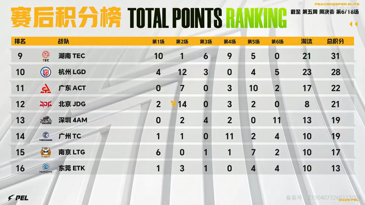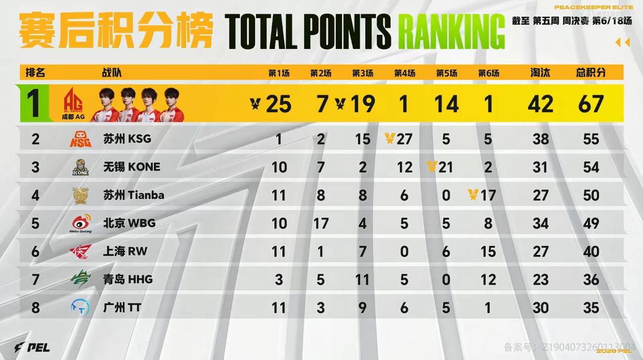 虎扑03月20日讯3月20日积分榜:2026PEL春季赛常规赛第5周周决赛首日,成都AG一日两鸡居榜首,KSG/KONE/天霸位列第二梯队。具体积分如下: