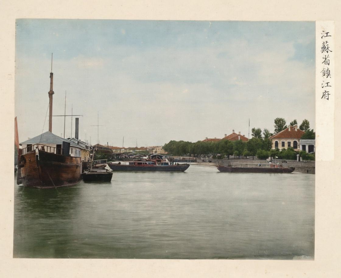清末,镇江府港口,定格了19世纪末至20世纪初镇江港的鲜活面貌,它是长江与京杭大运河交汇的核心枢纽,也是近代中国最早开埠的内河港口之一,右侧标注“江蘇省鎮江府”。 宽阔的水面是长江,镇江“江河交汇”的地理优势让它成为南北水运的咽喉。画面中既有带烟囱、桅杆的蒸汽轮船,也有传统木船与驳船。右侧岸边可见西式洋房,这是镇江开埠后洋行、租界或海关等机构的建筑遗存。 镇江曾是清代漕运、盐运的核心节点,京杭大运河与长江在此交汇,是江南物资北运的关键枢纽;开埠后,又成为西方商品输入中国内陆的重要门户。