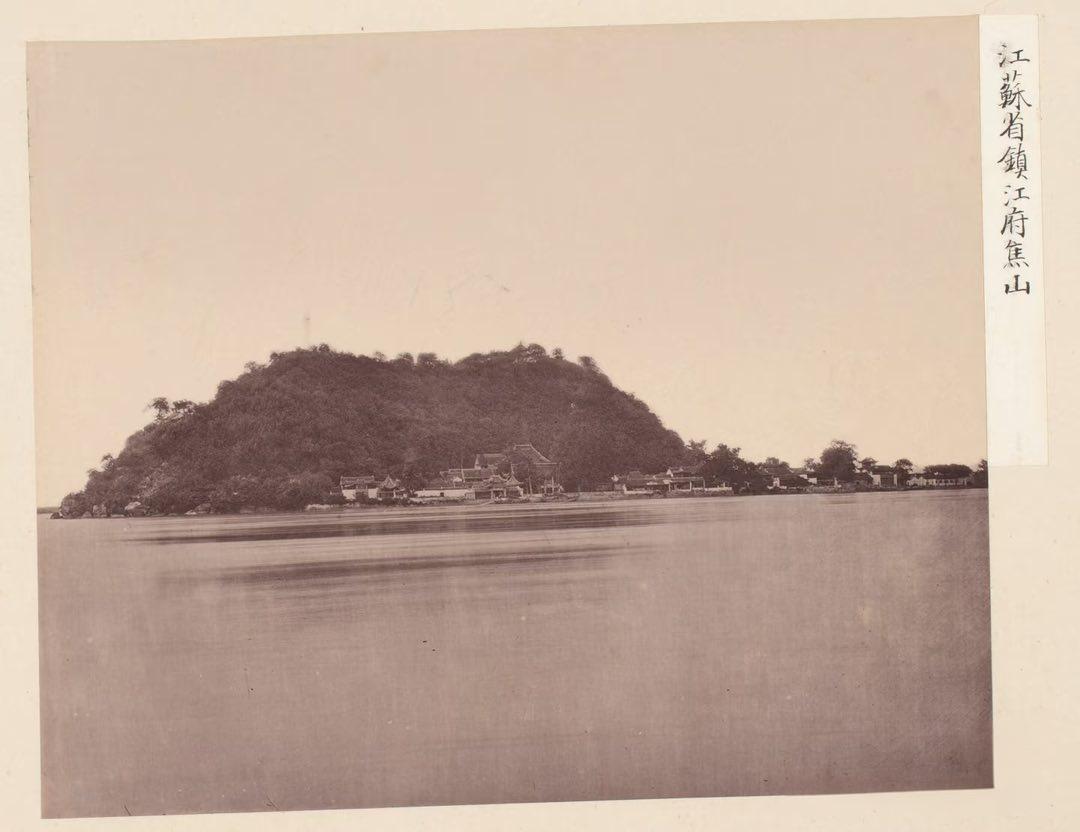 清末,镇江焦山,右侧标注“江蘇省鎮江府焦山”。 焦山是镇江“三山”(金山、焦山、北固山)之一,宛如一块浮玉镶嵌在长江之中。照片里山体植被茂密、郁郁葱葱,山麓依江而建的中式古建筑群,正是焦山的核心人文景观。开阔的江面是长江主航道,焦山扼守长江天险,清代在此修筑炮台,在鸦片战争、太平天国运动中均发挥过防御作用,自古便是兵家必争之地。
