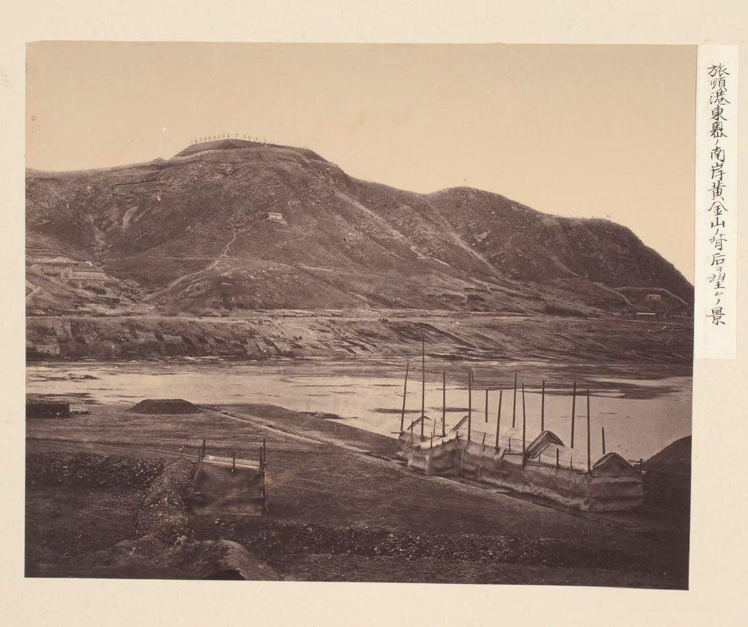 日占时期旅顺港,黄金山炮台与东澳南岸的要塞风貌。照片右侧日文标注“旅順港東澳ノ南岸黄金山背後望ムノ景”,意为从旅顺港东澳南岸眺望黄金山背后的景色。 黄金山是旅顺港的天然制高点,山顶的圆形工事就是晚清北洋水师修建的黄金山炮台——这是旅顺要塞的核心防御工事之一,装备大口径海岸炮,扼守旅顺港入口,号称“旅顺东大门”。 旅顺港东澳南岸,可见简易码头、帆布棚屋(临时营房/仓库)与土工作业痕迹,中景港湾内停泊着带桅杆的舢板/小船,是港口后勤与防御配套的典型风貌。山体上可见蜿蜒的道路与小型工事,彰显出这里是一座层层布防的近代化军事要塞,而非普通民用港口。