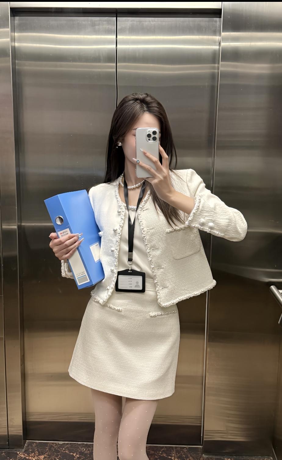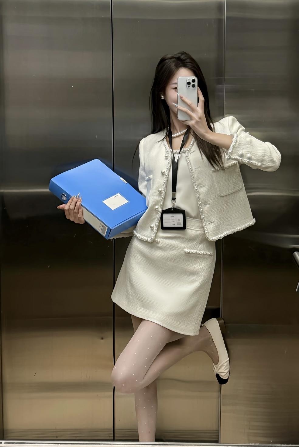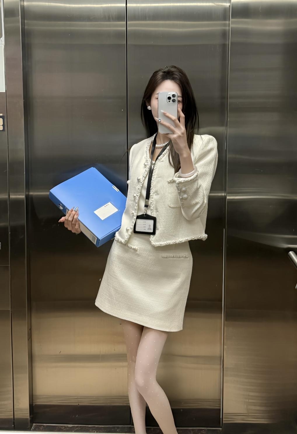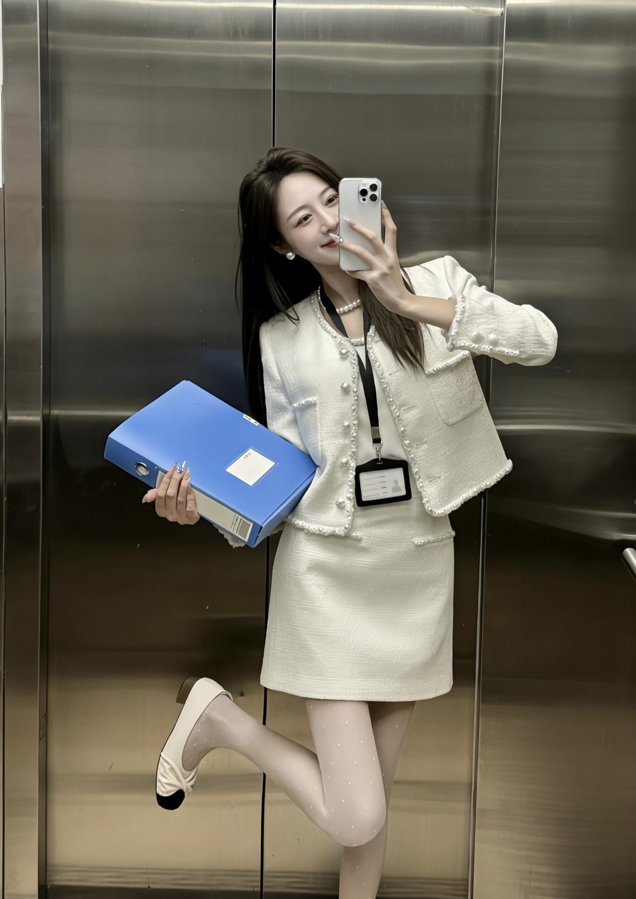 正常穿搭推荐,无不良引导 今天推荐这套是温柔干练的小香风通勤套装,整体奶白色调,精致又不失温柔感: • 上衣:短款粗花呢小香风外套,边缘和门襟点缀珍珠纽扣,既保留了粗花呢的肌理感,又通过珍珠元素增添了优雅精致感,内搭同色系缎面吊带,中和了外套的硬朗,更显温柔。 • 下装:同面料A字短裙,长度在大腿中部,高腰设计拉长腿部线条,裙身也有珍珠装饰,和外套形成呼应,整体更协调。 • 配饰与鞋袜:珍珠项链+小巧耳钉,提升精致度;波点丝袜+黑白拼色玛丽珍鞋,在通勤感中注入了一丝甜美元气,同时保持了得体感。 这套穿搭的风格介于正式与休闲之间,适配度很高: 1. 职场通勤 ✅ 小香风套装自带专业感,长度得体、配色干净,非常适合办公室、部门会议、客户对接等职场场景,既不会过于严肃,又能体现专业素养。 2. 轻商务场合 ✅ 比如小型商务洽谈、行业沙龙、公司团建,这套穿搭比正装更柔和,比休闲装更正式,能展现优雅得体的形象。 3. 日常约会/下午茶 ✅ 奶白色+珍珠元素自带温柔滤镜,搭配波点丝袜和玛丽珍鞋,甜而不腻,很适合和朋友约会、逛美术馆、喝下午茶,温柔又有气质。 4. 轻社交场合 ✅ 比如闺蜜聚会、品牌活动、小型展览,这套穿搭精致不张扬,能轻松融入氛围,拍照也很出片。 💡 小Tips • 如果想更休闲,可以把玛丽珍鞋换成小白鞋,瞬间切换成日常温柔风。 • 如果想更正式,可以换成纯色丝袜+低跟皮鞋,更适合重要会议或正式商务场合。