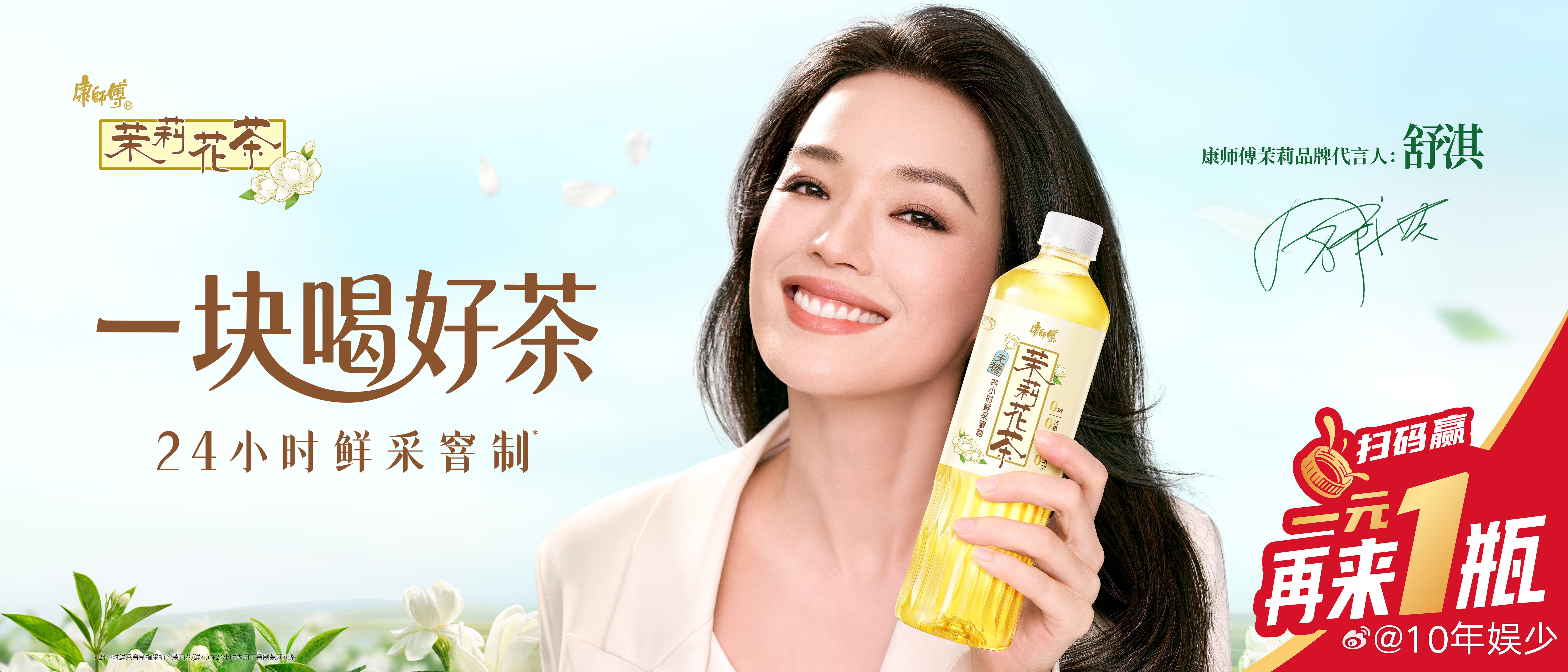 对一块钱的概念越来越模糊从屏幕到手中,舒淇的同款茶香轻松get。茉莉轻拂舌尖,仿佛春日漫步,一元再来一瓶,让幸福加倍绽放。 康师傅茉莉每一口清香如初绽