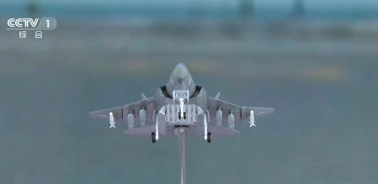 相当罕见,网络上出现一张歼-35舰载机外挂导弹图,出现在外侧折叠翼挂点上,有可能是PL-10导弹(或模拟弹)。歼-35之前有模型公开,每侧机翼下方有3个外挂点,比空军型要多一个,作为双发中型机载弹量相当可观。虽然以内置弹舱为主,但考虑到低烈度作战环境,或者纯碾压式作战条件,歼-35依然保留“野兽模式”,大量载弹完成多用途任务。