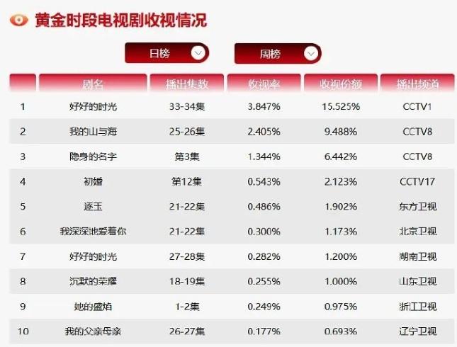 谭松韵《我的山与海》超点完结! 谭松韵新剧优酷站内热度只有8500,超点完结的云合集均只有560万,几乎是创26年播放量历史新低,但是CVB收视率创26年历史新高了,连续三天收视率破2.4%,目前平均收视率已经破2.1%,暂列央八年冠,陈飞宇《纯真年代的爱情》央八第二,赵丽颖《小城大事》央八第三,看来赵丽颖首部央视上星剧央五卫三的实绩不保了。