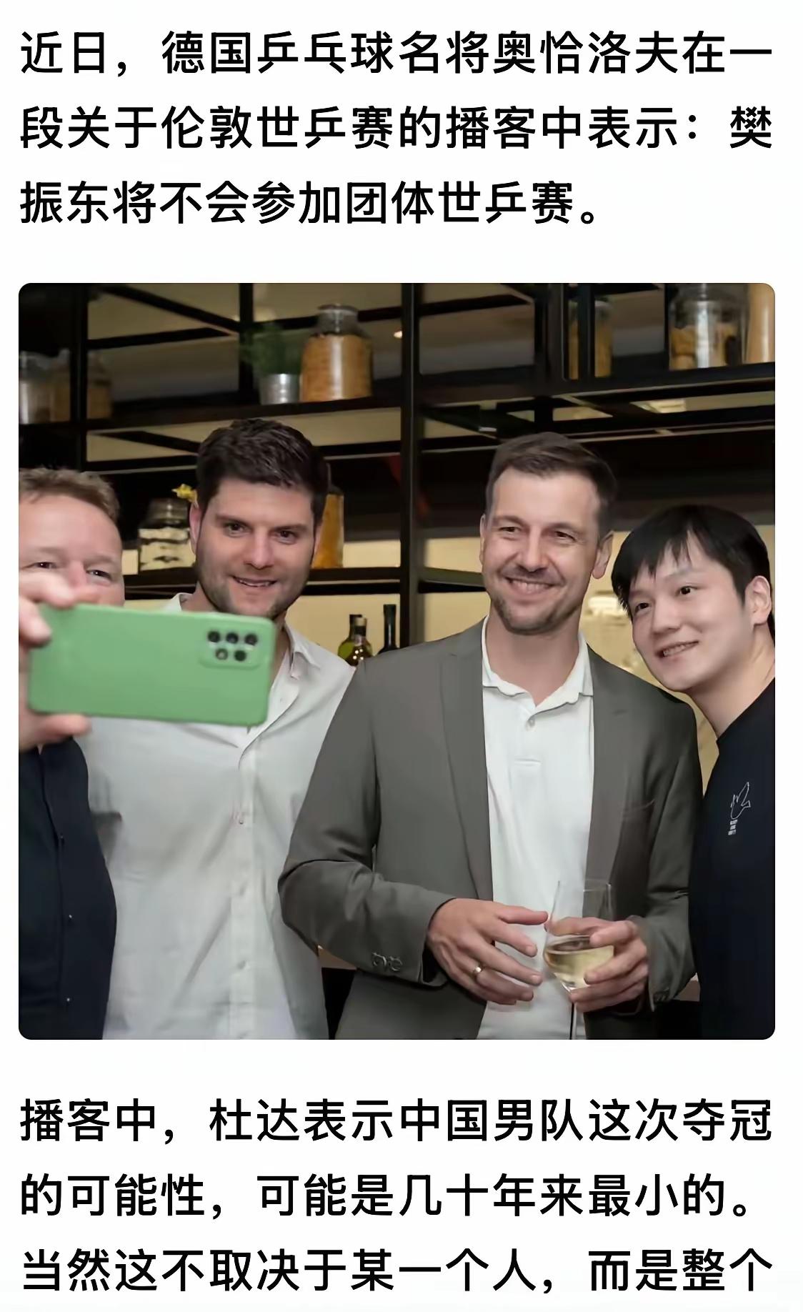 樊振东不参加伦敦世乒赛了吗? 今天网上不断传来樊振东不参加伦敦世乒赛的消息,消息来源主要是: 一是樊振东好友奥恰洛夫称,他有消息来源可以佐证樊振东不参加伦敦世乒赛。 二是樊振东另外一个好友波尔称,樊振东很享受现在的生活,很充实,没有接到中国乒协的召唤。 以上两点颇让人讶异,一是樊振东自己没有亲自说,二是波尔称樊振东没有接到中国乒协的召唤,不是王主席日前称一直在和樊振东在沟通吗? 请教各位大佬,樊振东究竟回不回来参加伦敦世乒赛呢?最后请允许在这里说一句,无论樊振东做出什么样的选择,都尊重他的决定。