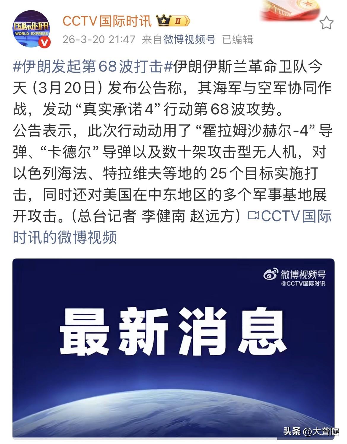 报复继续,伊朗‘’真实承诺4‘’第68波攻击正式开启! 伊朗革命卫队在公告中表示‘’真实承诺4‘’第68轮军事打击已启动,以色列境内25个军事目标和美军多个基地将成为此次攻击的目标。 今天,伊朗伊斯兰革命卫队发言人阿里·穆罕默德·纳伊尼遭遇袭击身亡,伊朗接连发动军事行动旨在为他复仇。