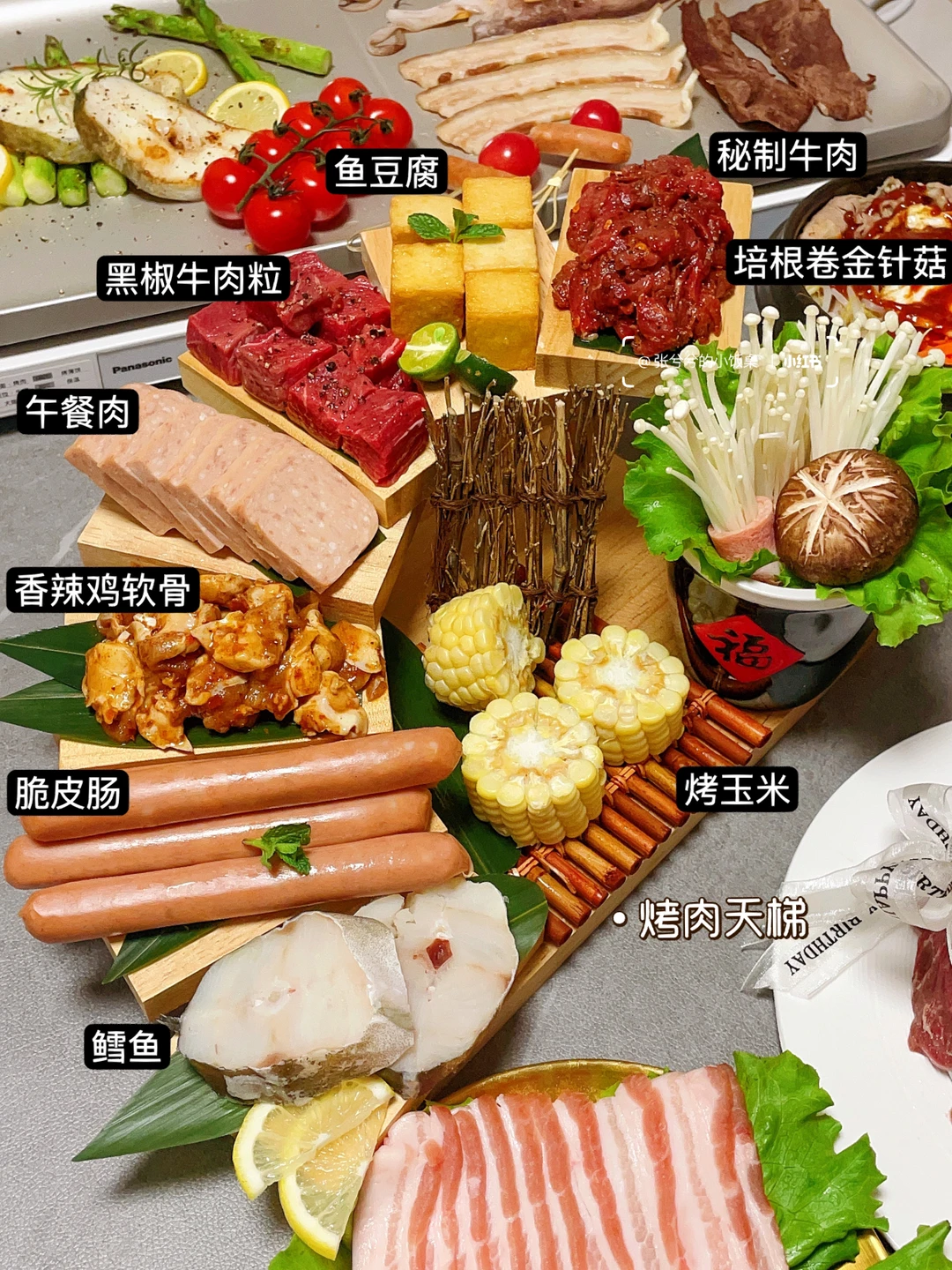 烤肉天梯:秘制牛肉|黑椒牛肉粒|香辣鸡软骨|午餐肉|鱼豆腐|脆皮爆汁肠|鳕鱼|培根卷金针菇
