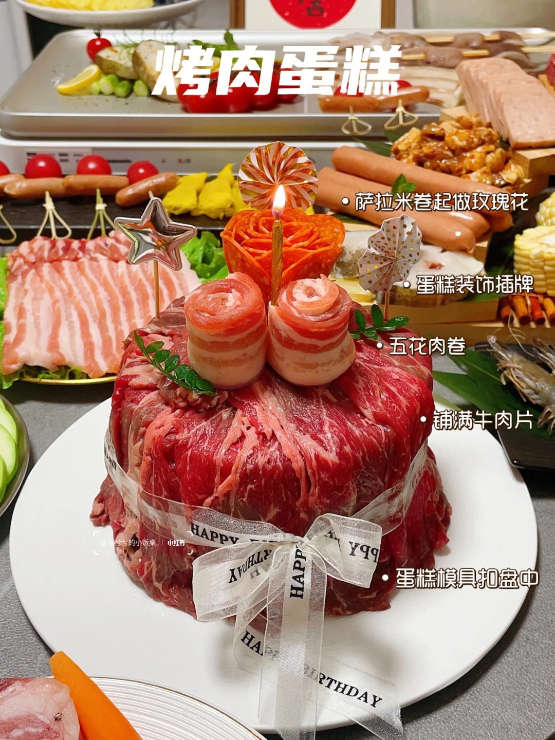 今天朋友生日邀请他们在家里聚餐,安排了烤肉局招待大家。时间来不及没有订蛋糕,就做了个烤肉蛋糕,大家都好惊喜、仪式感十足[派对R]