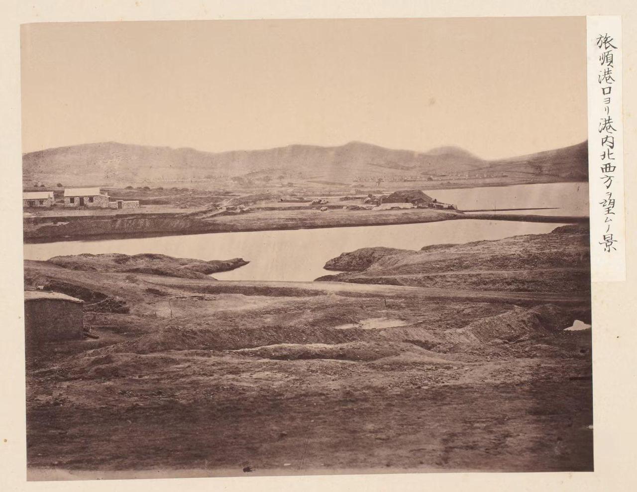 日占时期旅顺港,从港口望向港内西北方的沧桑景象。照片右侧日文标注“旅順港口ヨリ港内北西方望ムノ景”,意为从旅顺港口向港内西北方眺望的景色。 荒芜的土坡沟壑、散落的简陋石屋,地面坑洼不平,港内的内湾水域,岸边分布着低矮的兵营、仓库或临时工事,土堆与建筑交错,是北洋水师时期遗留的港口配套设施,也是日占时期的殖民据点。 连绵的丘陵山地,是旅顺港天然的地理屏障,晚清时曾在此修筑炮台等防御工事,构成“远东第一要塞”的核心防御体系。