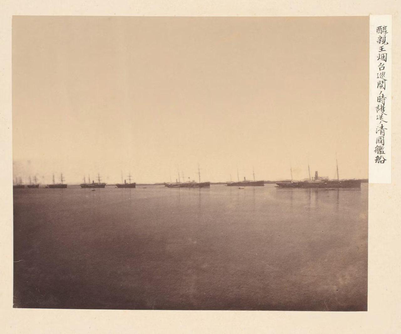 1886年,烟台港,醇亲王巡阅北洋海防时的护航舰队,照片右侧的日文标注“醇親王煙台巡閲ノ時護送スル清國艦船”,意为“醇亲王在烟台巡阅时,负责护送的清国舰船”。 1886年5月,奕譞在李鸿章、善庆等重臣陪同下,从天津出发巡阅北洋水师,先后检阅旅顺、威海卫要塞,最终抵达烟台,照片正是他在烟台期间,北洋水师主力舰船集结护航的现场。 宽阔的烟台海面上,多艘近代化蒸汽军舰整齐停泊,包括北洋水师核心主力(如“定远”“镇远”“济远”等铁甲舰、巡洋舰),桅杆林立、烟囱高耸,直观展现了北洋水师“亚洲第一、世界第六”的鼎盛规模。