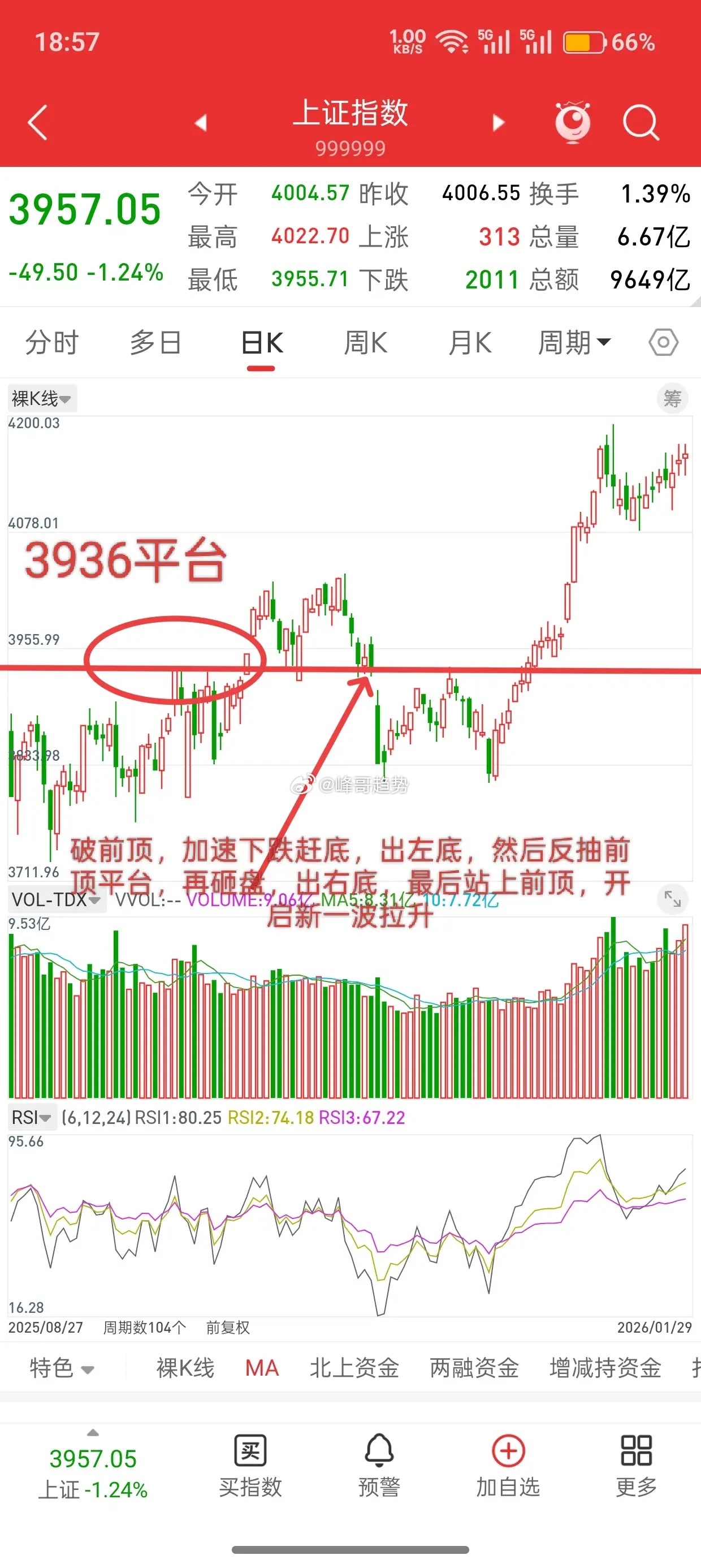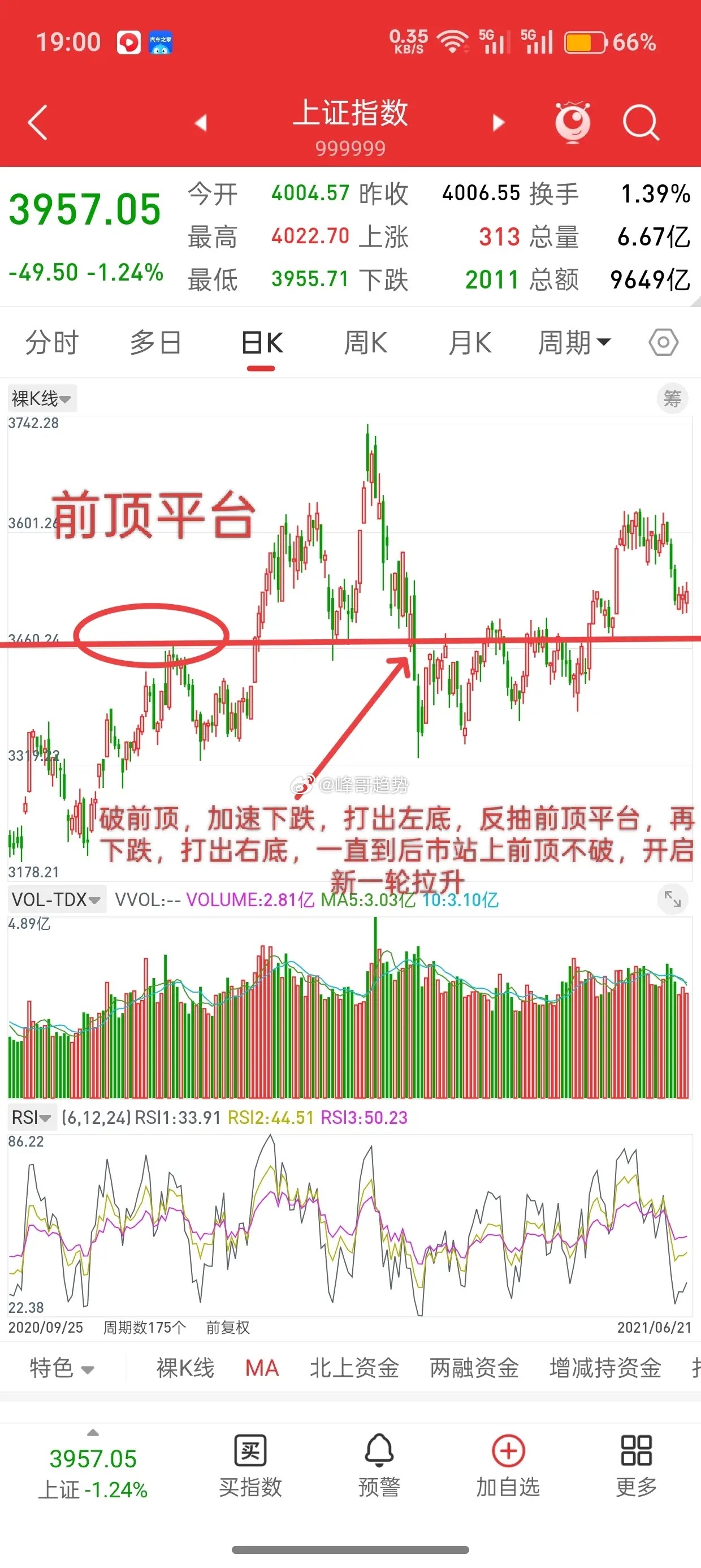 而昨天跌破前顶平台4025,今天周五加速下跌,下周一会不会打出一个新低,也就是左底,我认为大概率。