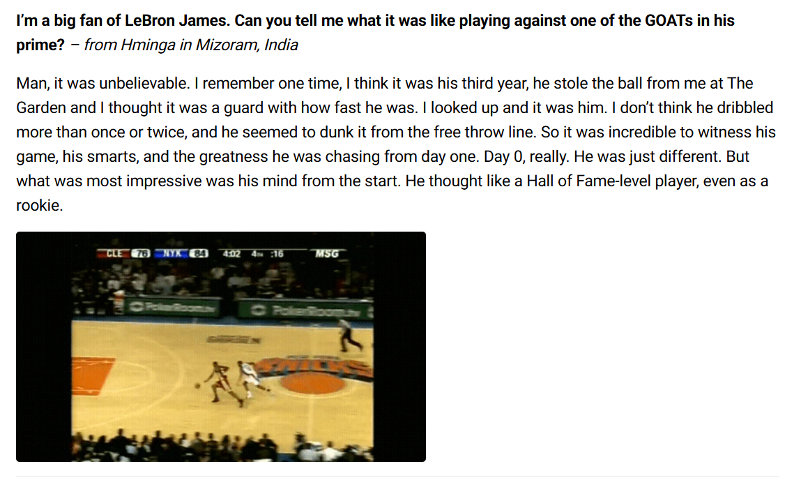 克劳福德回答:“天呐,那场面简直难以置信。我记得有一次,应该是他生涯第三年,他在麦迪逊广场花园直接从我手里把球断走。那速度快得我还以为是个后卫,抬头一看才发现是他。他好像就运了一两下球,感觉直接从罚球线起跳扣篮了。能亲眼见证他的比赛、他的球商,还有他从第一天起就在追逐的伟大,真的太不可思议了。其实从他刚进联盟那天起就是如此,他就是那么的与众不同。但最让我印象深刻的,是他从一开始就拥有的心智,即便还是新秀,他的思考方式就已经是名人堂级别的球员水准了。”